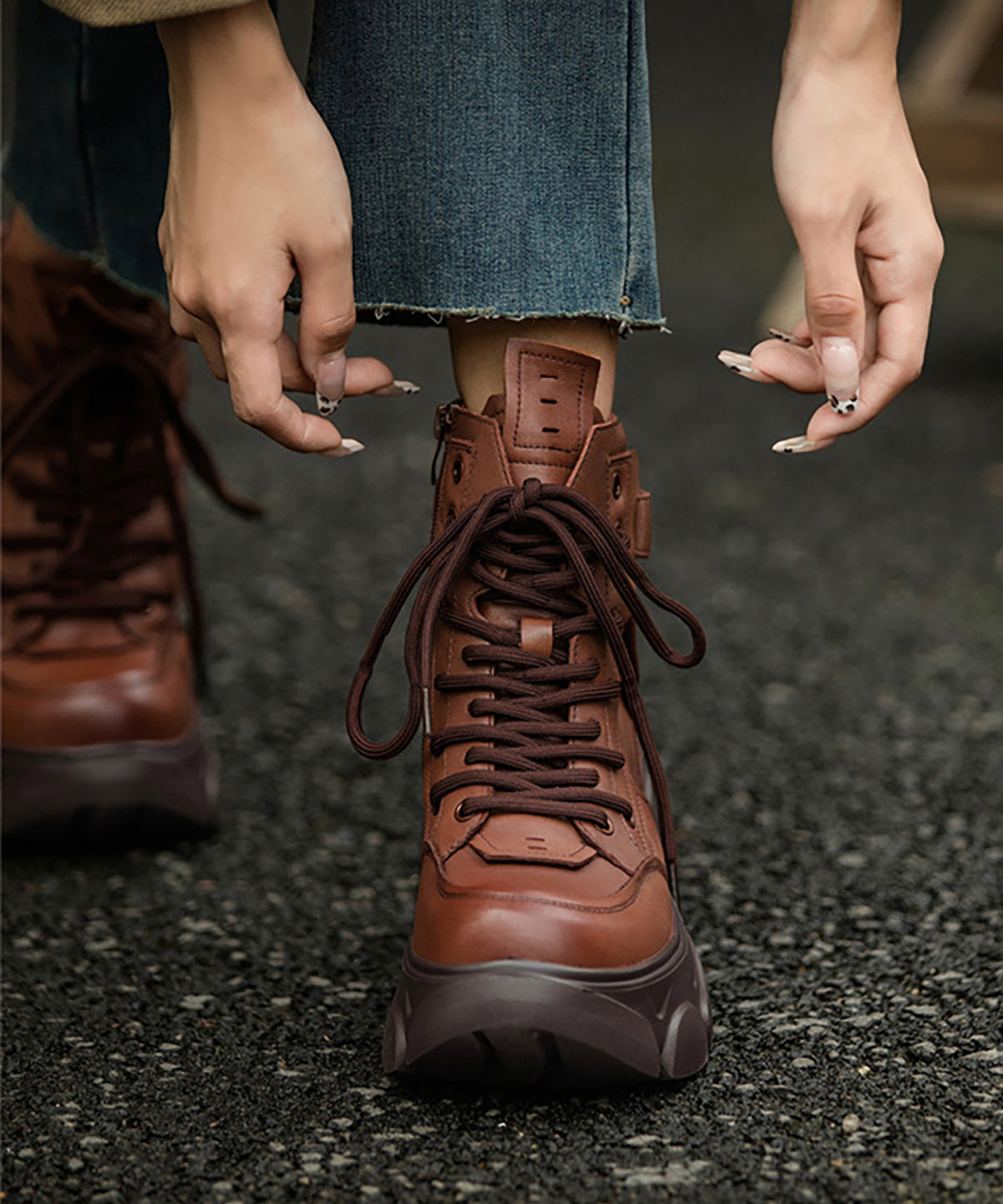 Yellow Lace Up Splicing Cowhide Leather Platform Boots