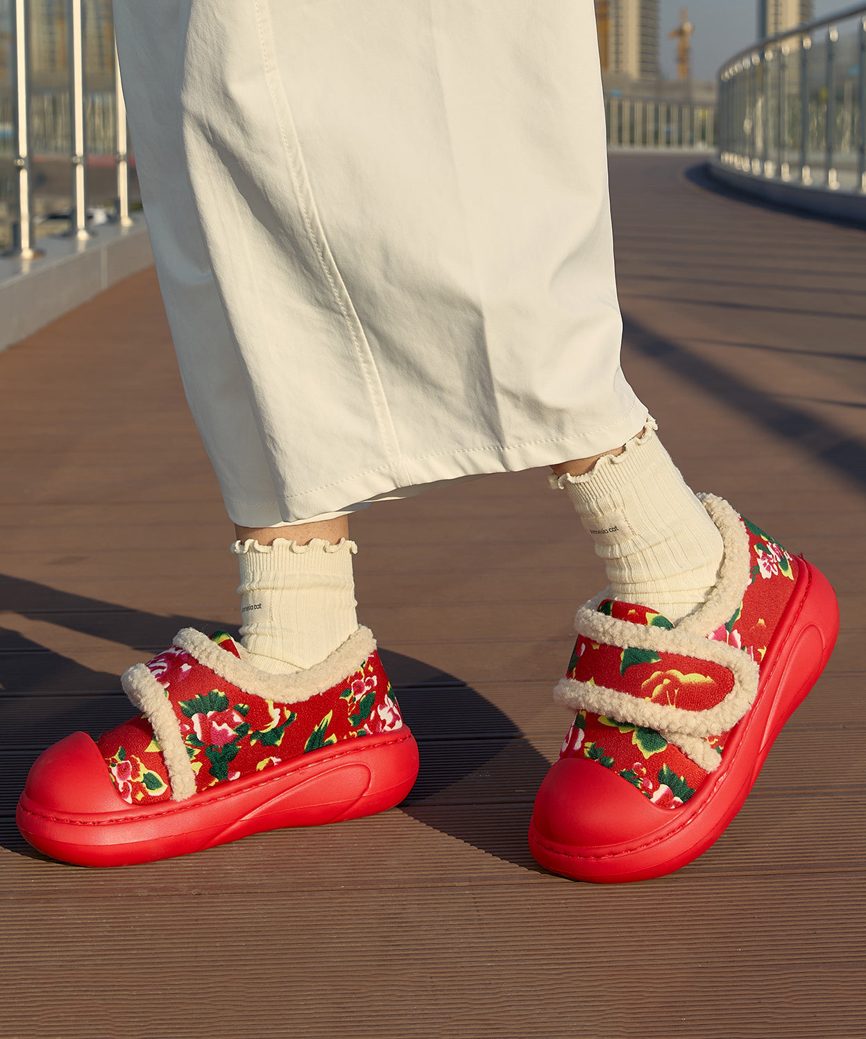 Red Cotton Fabric Flat Shoes Splicing Fuzzy Wool Lined