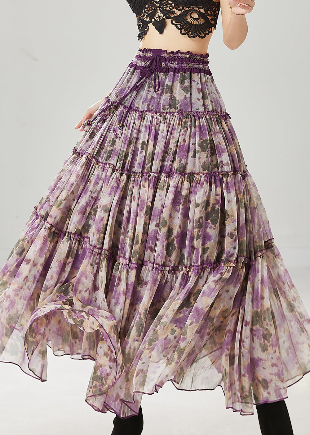 Purple Print Chiffon Skirts Elastic Waist Ruffled Spring