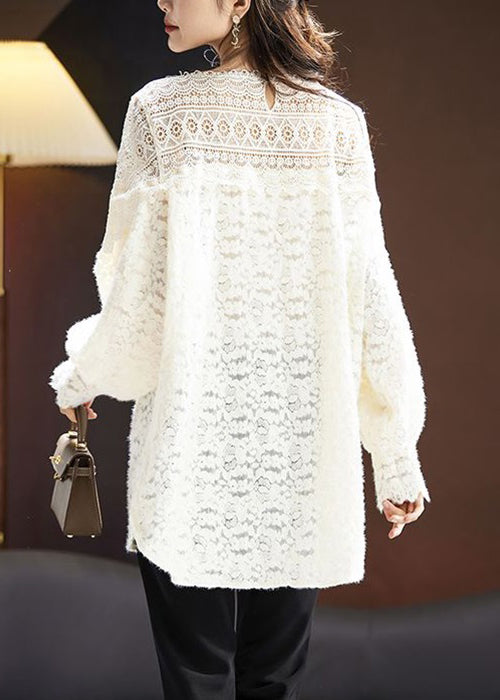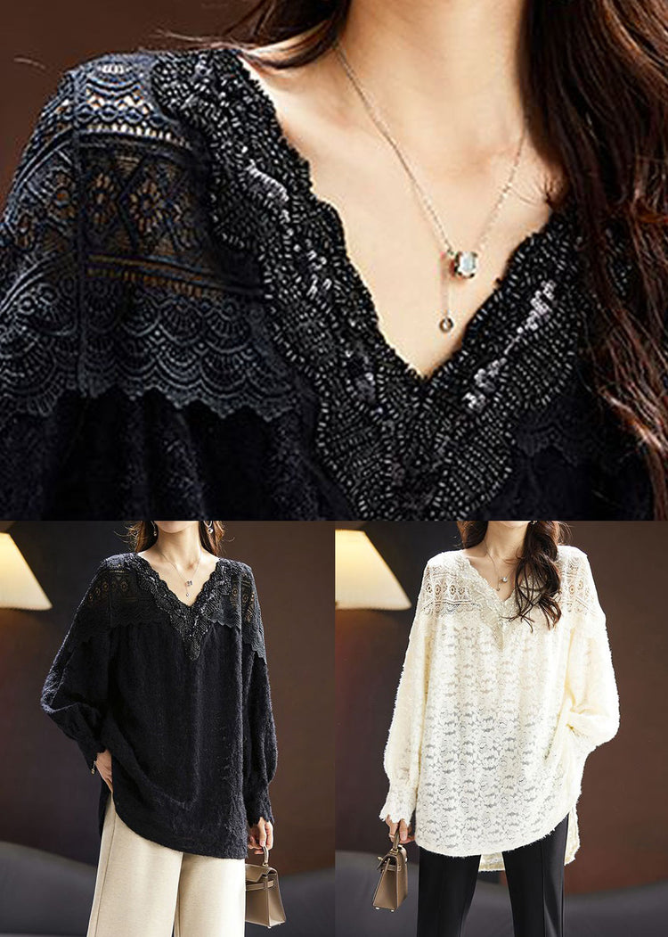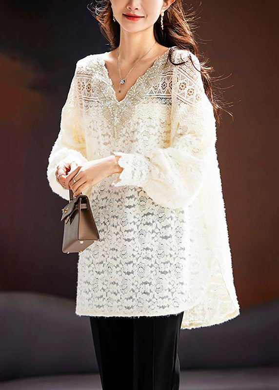 Beige Hollow Out Lace Top V Neck Long Sleeve