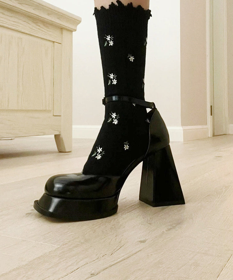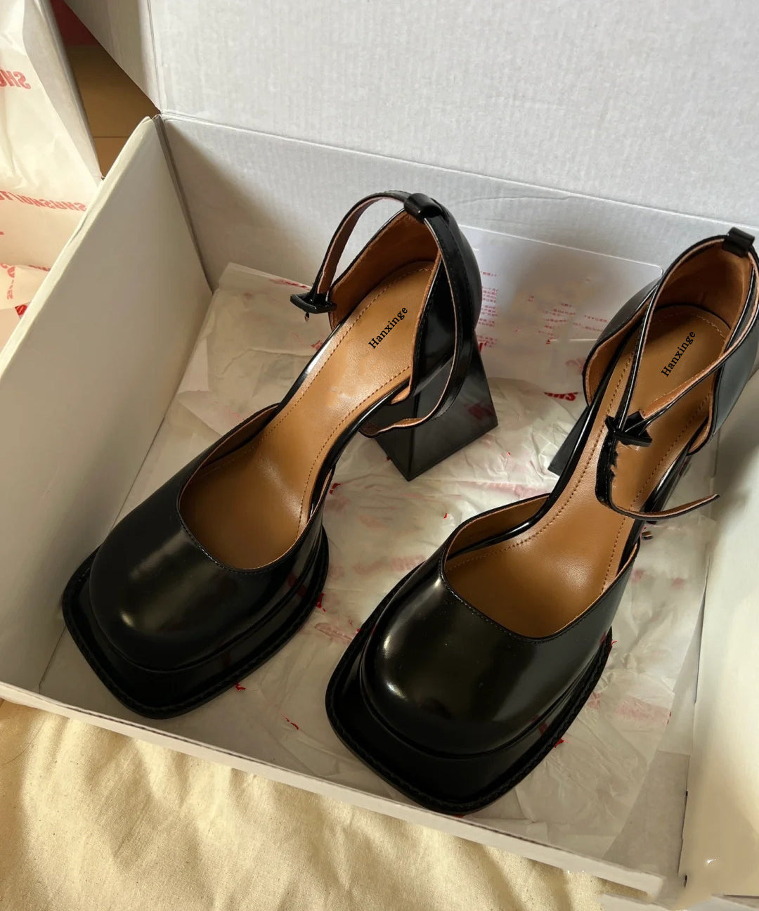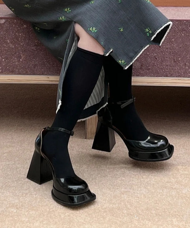 Black Chunky High Heels Faux Leather Stylish Splicing Buckle Strap