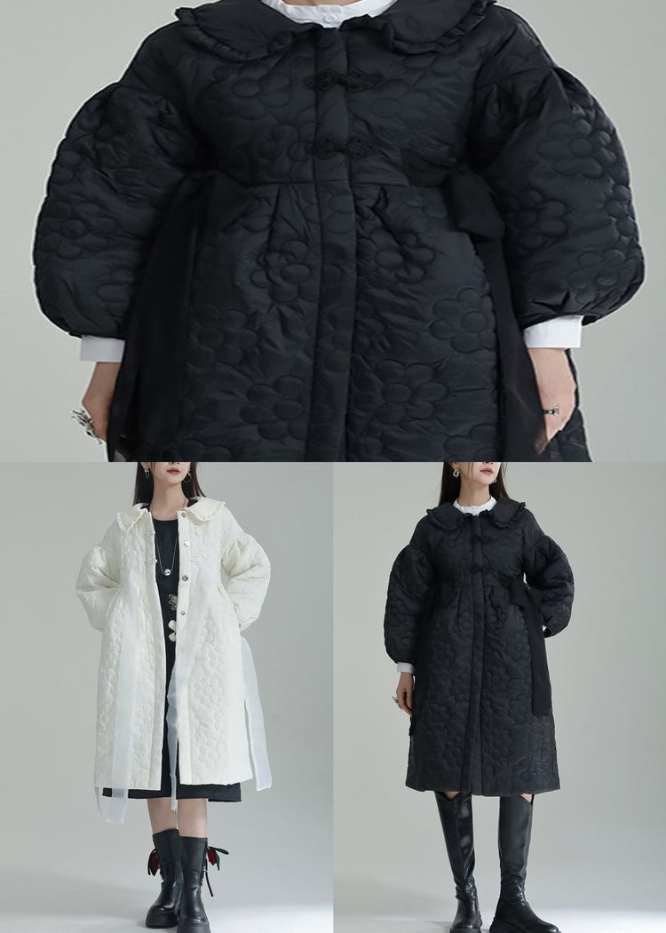Black Embossed Cotton Filled Coat Peter Pan Collar Lantern Sleeve