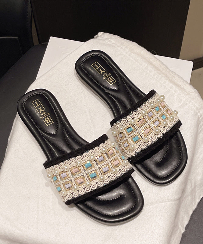 Black Faux Leather Splicing Slide Sandals Peep Toe Nail Bead