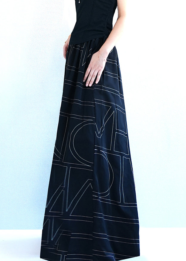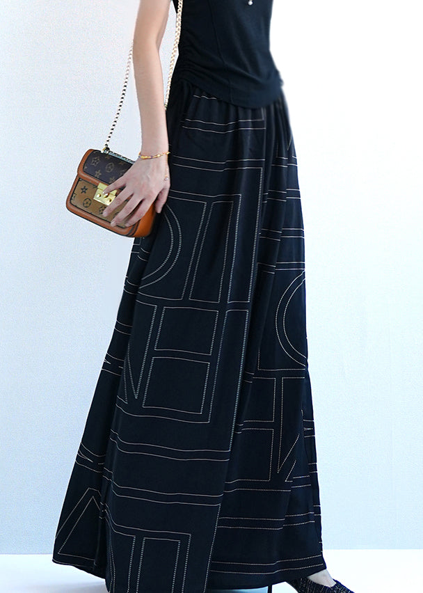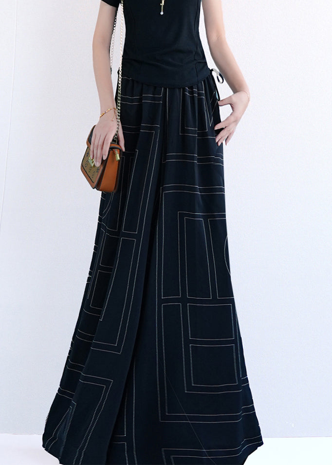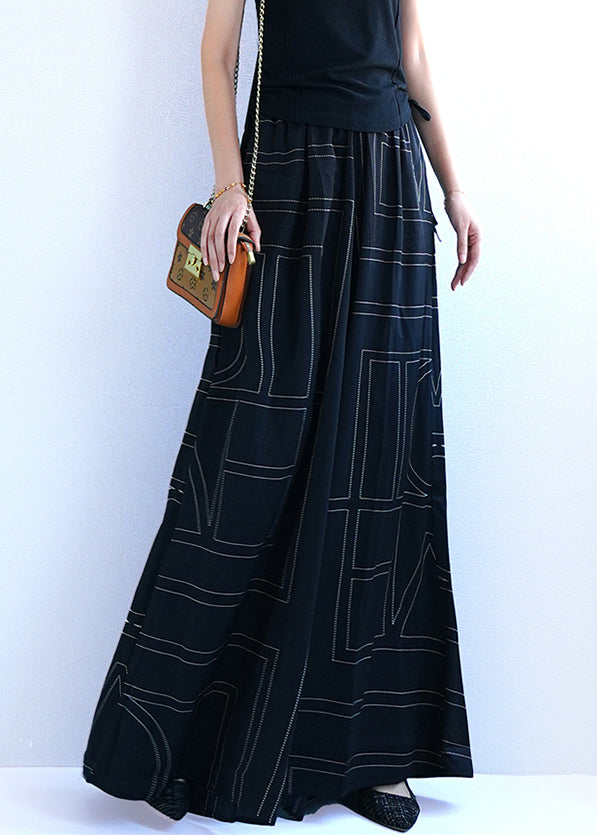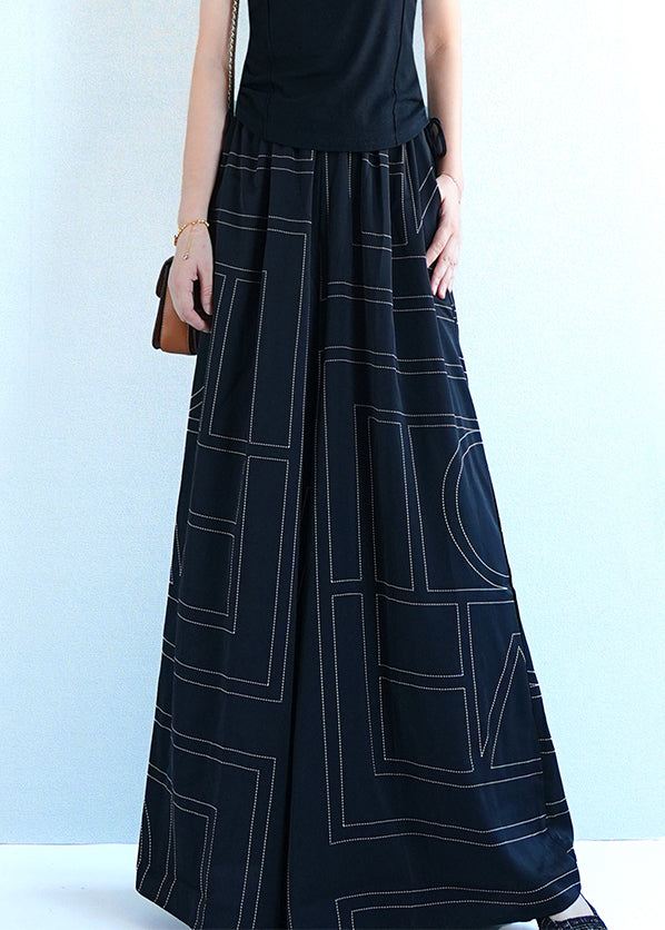 Black Geometric Pockets Cotton Wide Leg Pants Elastic Waist Summer