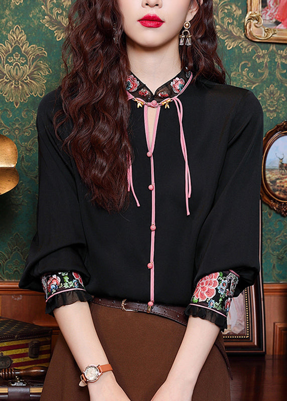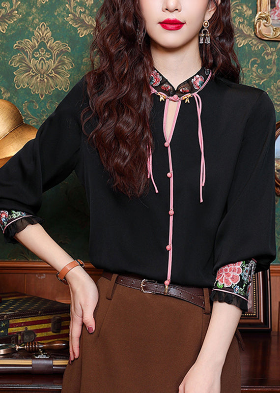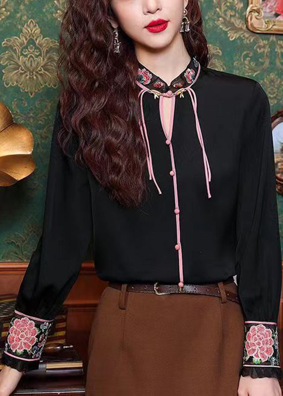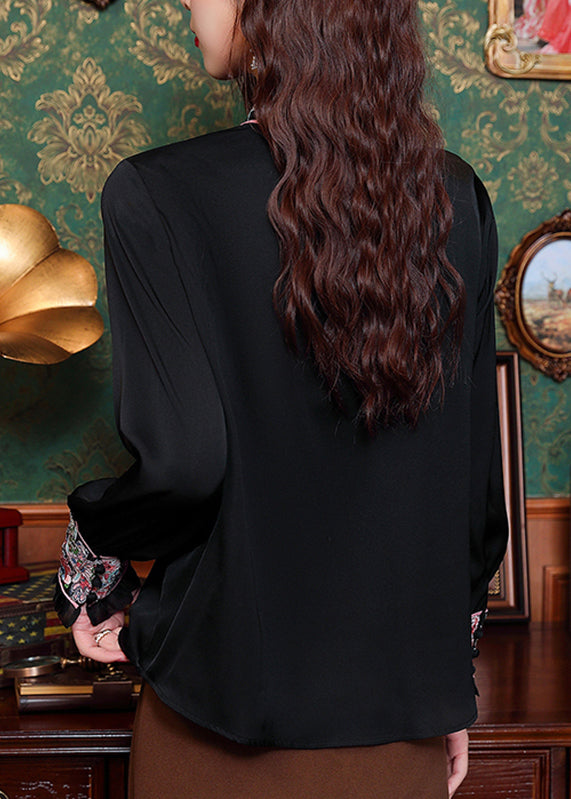 Black Hollow Out Button Silk Shirt Long Sleeve