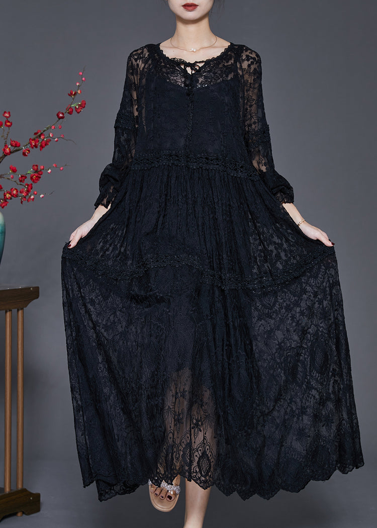 Black Hollow Out Lace Long Dress Two Pieces Set Embroidered Spring