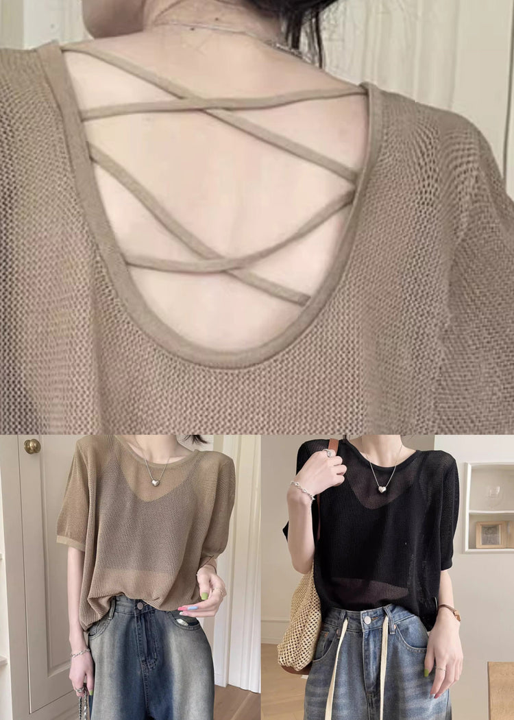 Black Hollow Out Solid Summer Knit T Shirts O Neck