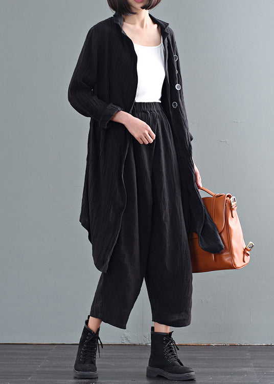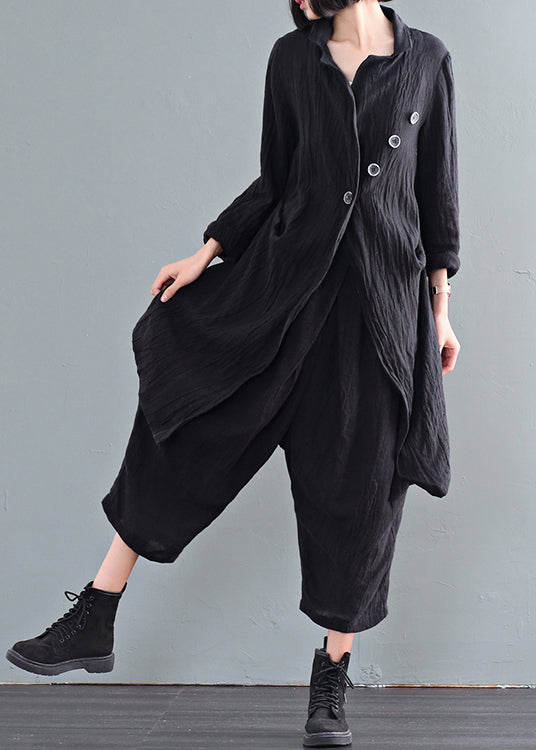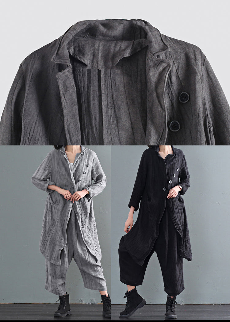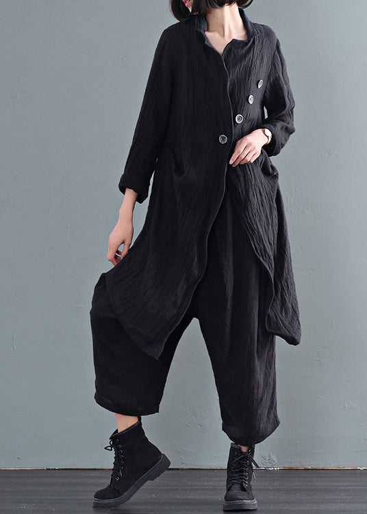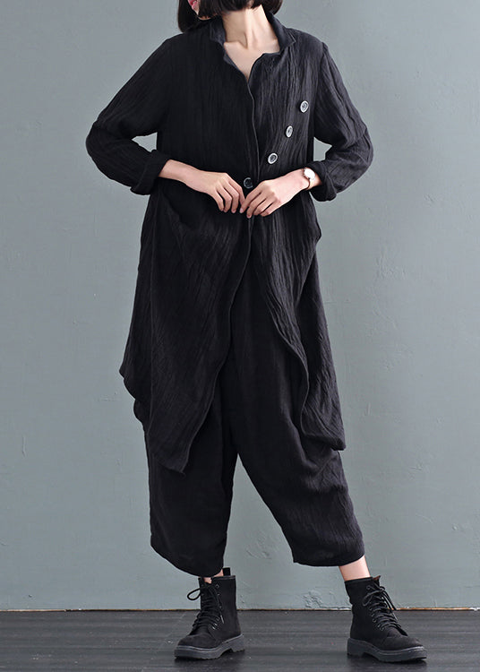 Black Oversized Linen Trench Coats Wrinkled Button Fall