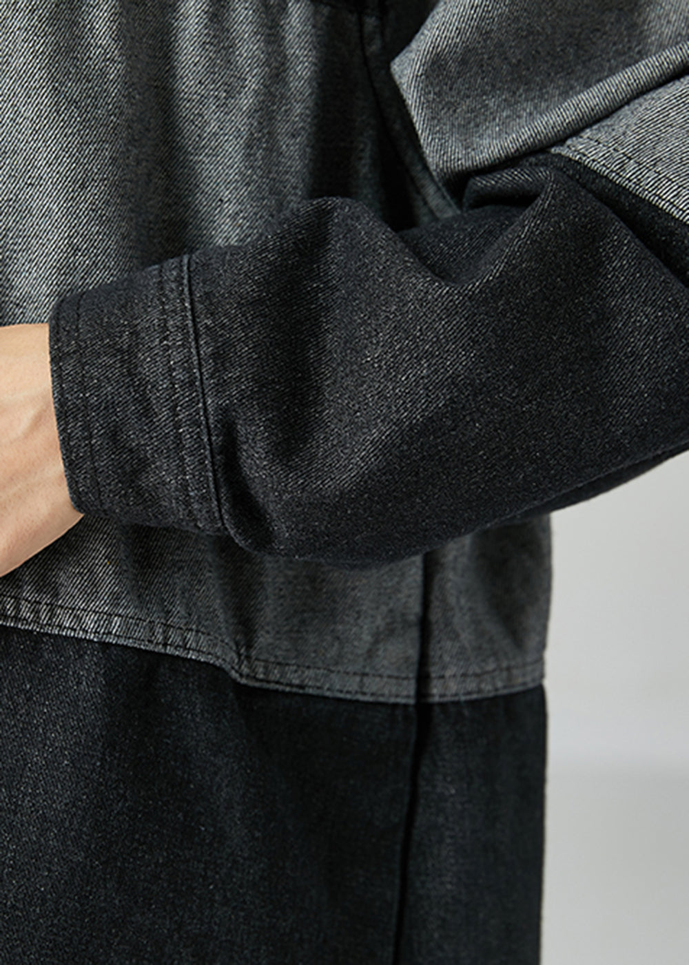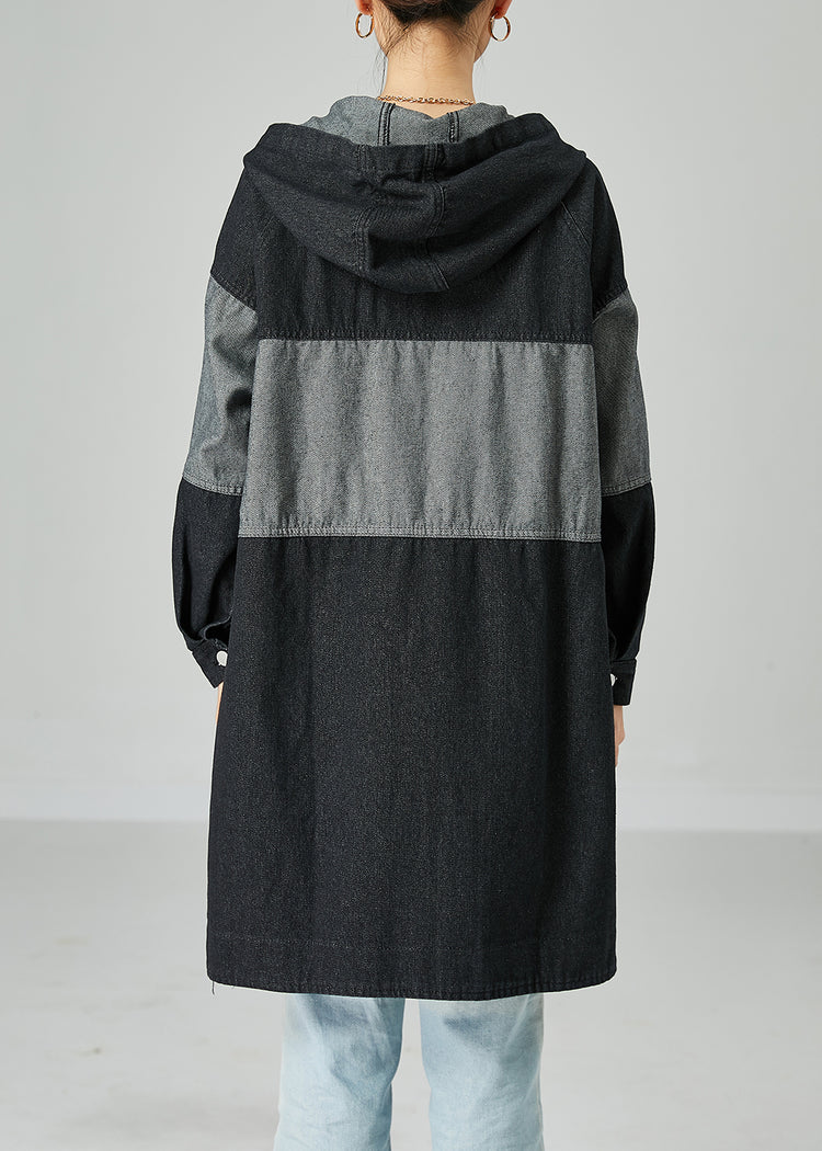 Black Patchwork Cotton Denim Trench Coat Hooded Oversized Spring