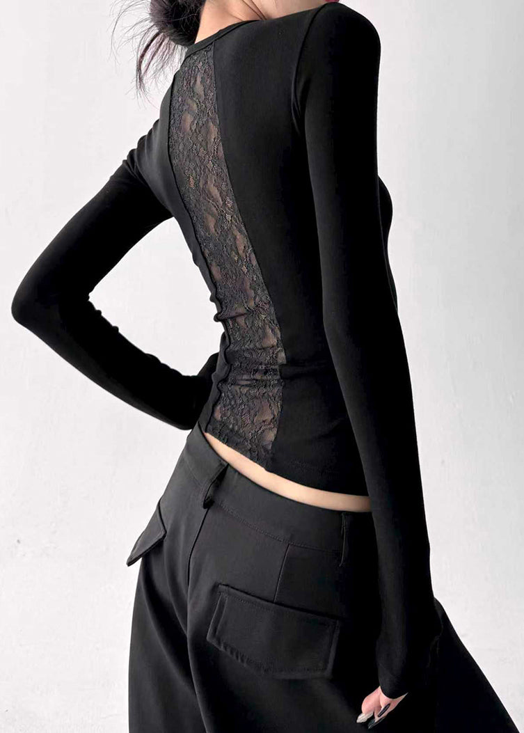 Black Patchwork Lace Blouse Top Hollow Out Fall