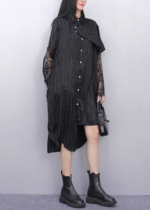 Black Patchwork Lace Striped Shirt Dress Asymmetrical Summer