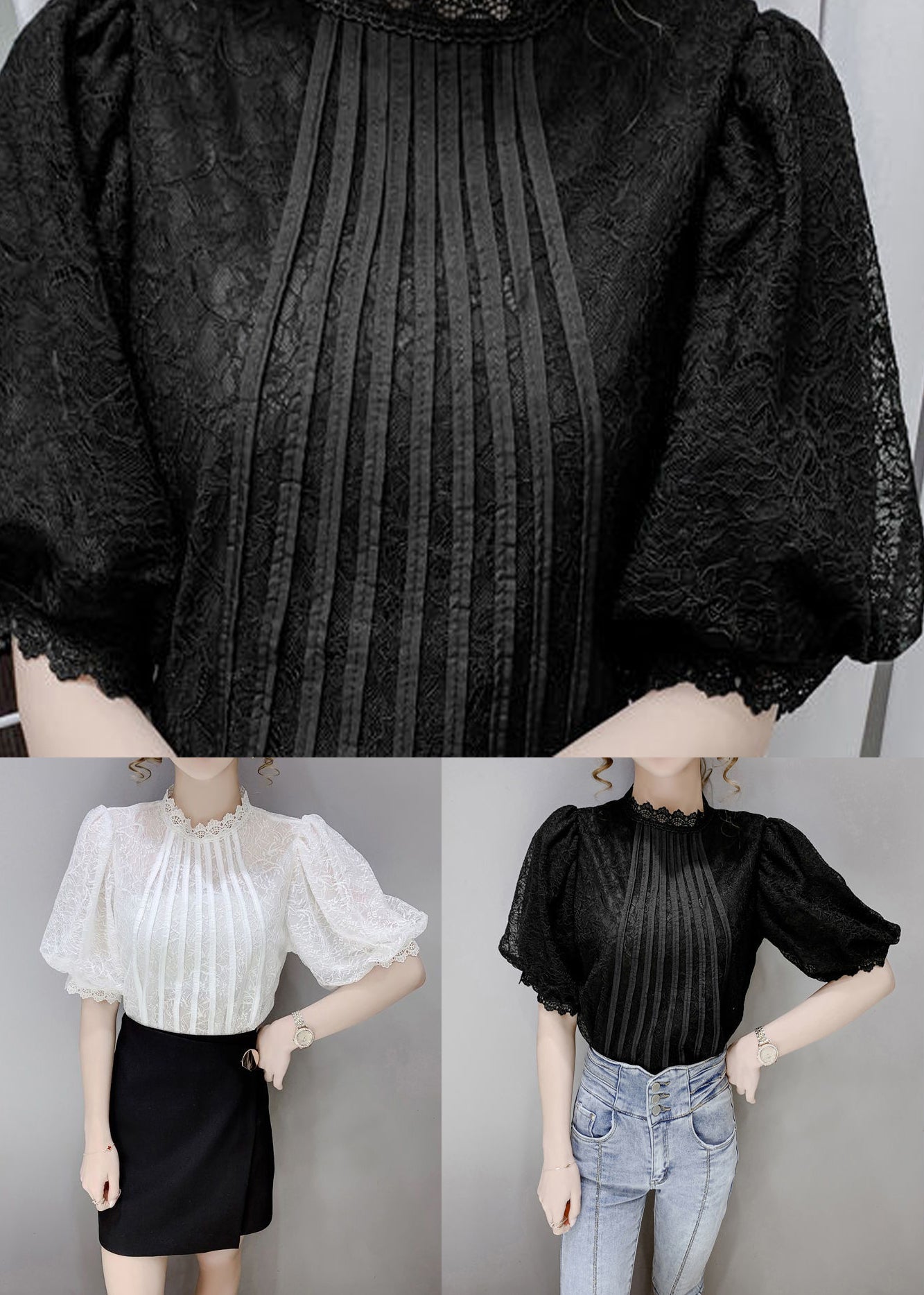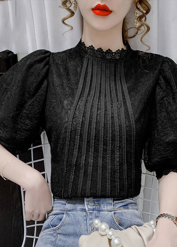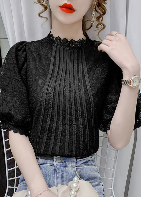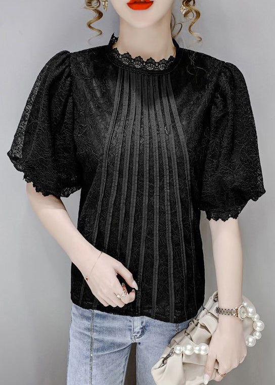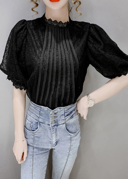 Black Patchwork Lace Tops Hollow Out Wrinkled Puff Sleeve
