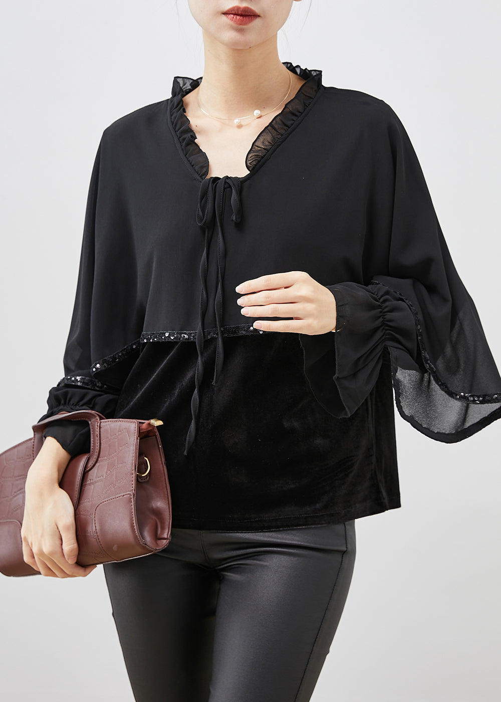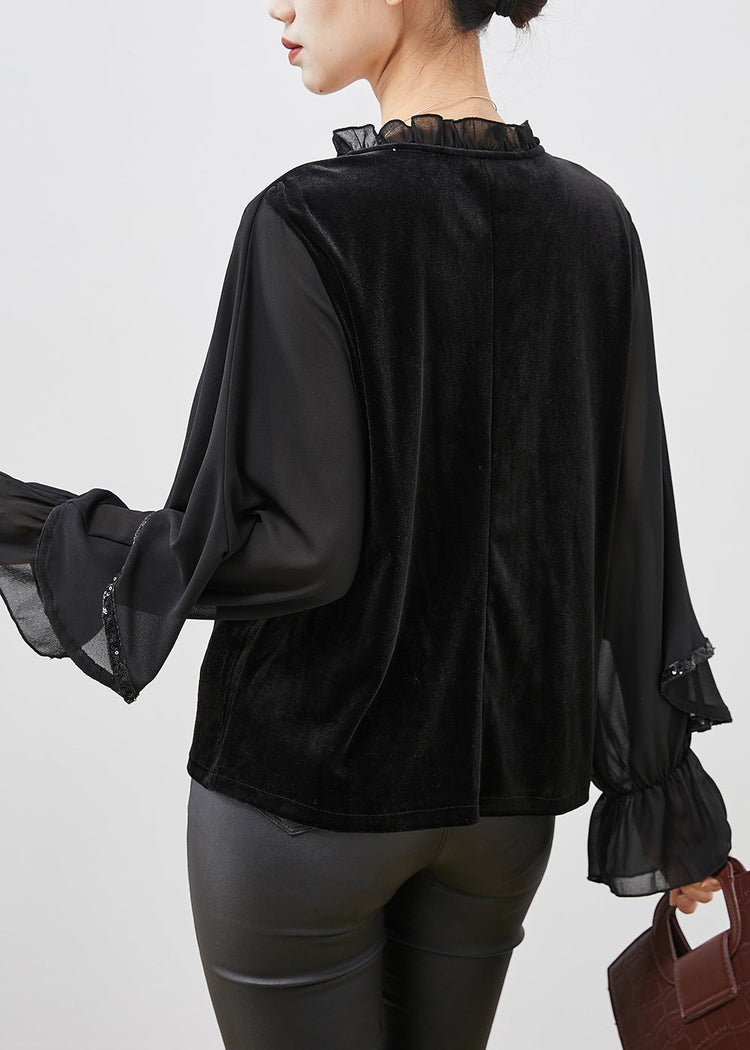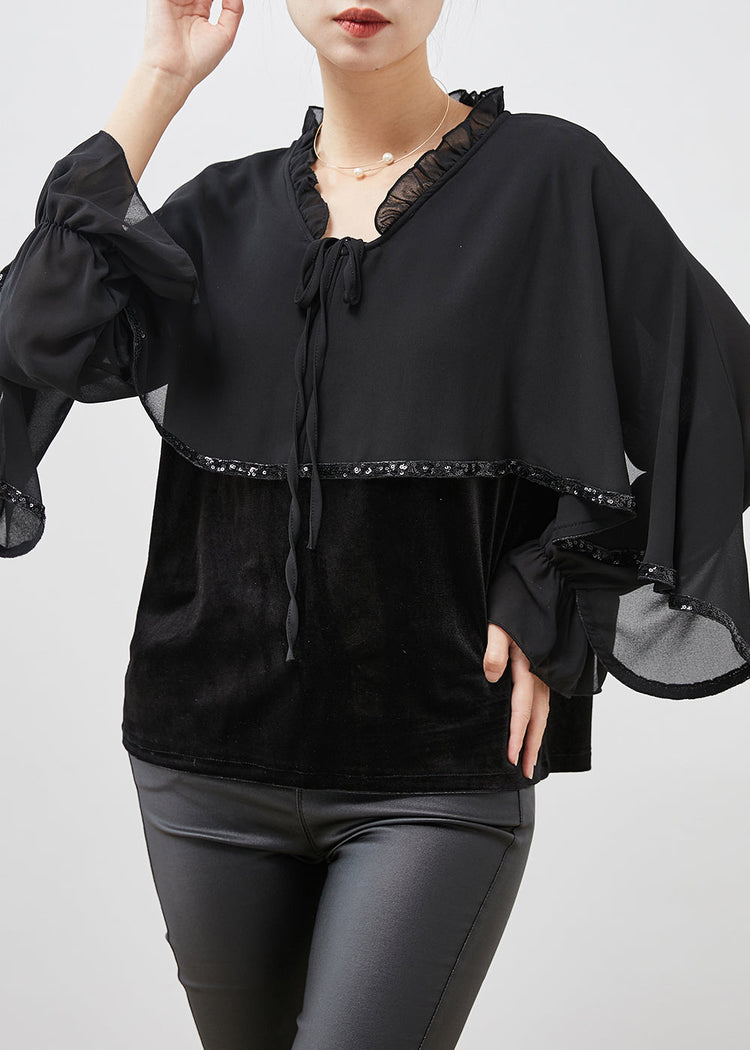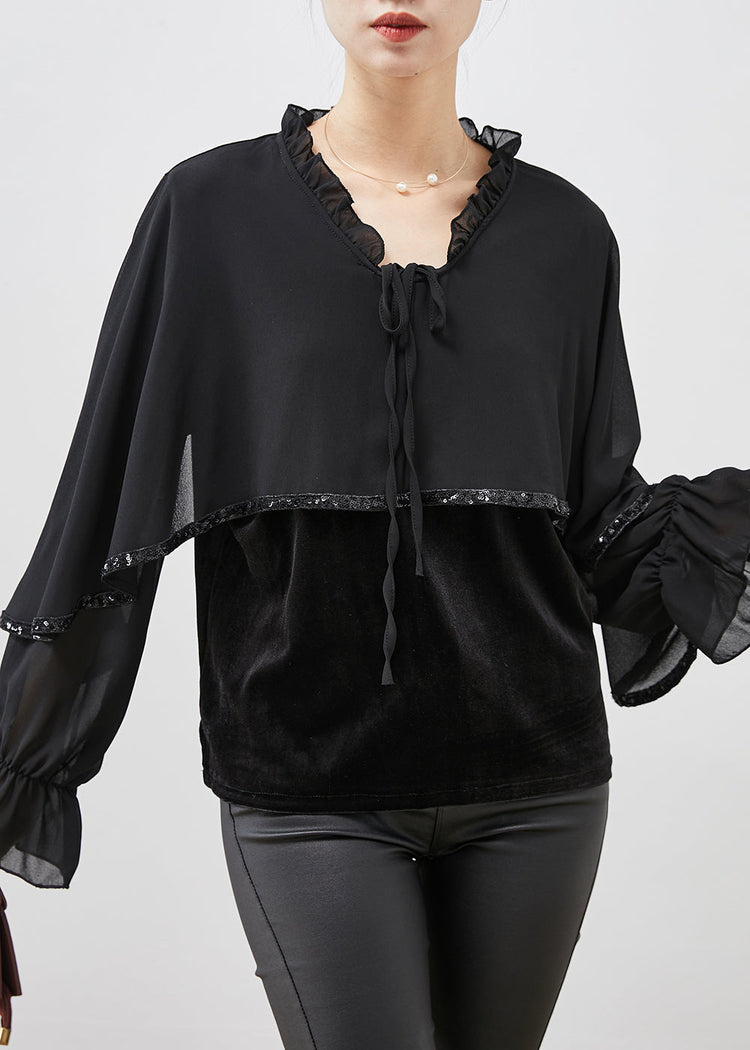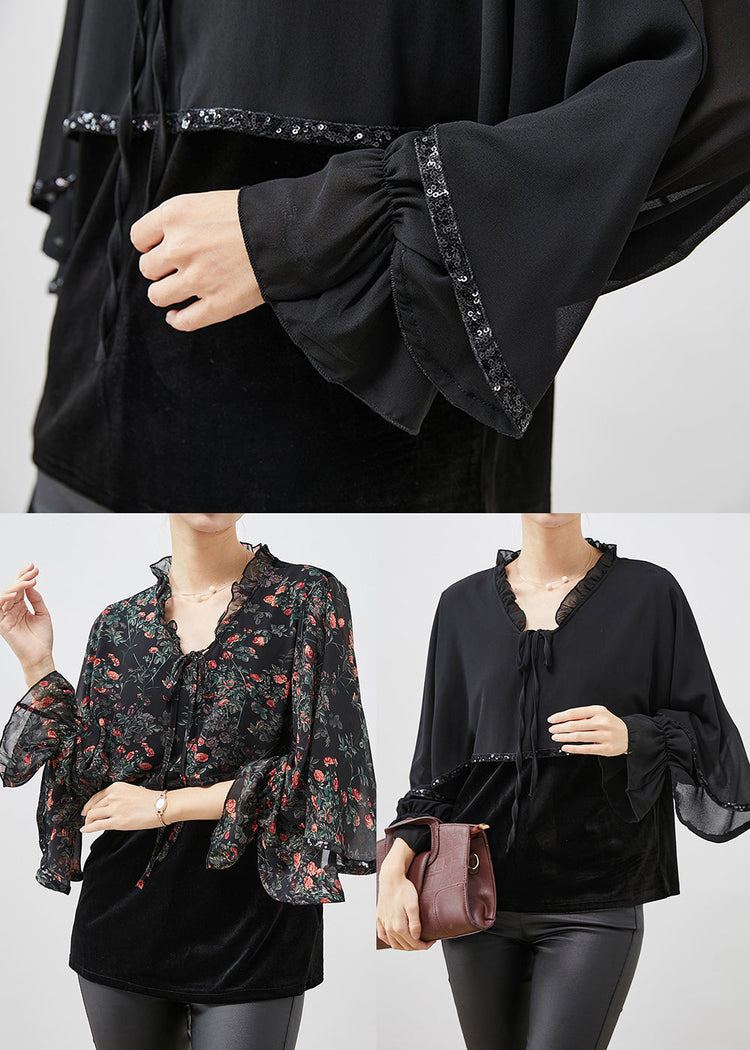 Black Patchwork Velour Chiffon Shirt Ruffled Lace Up Spring
