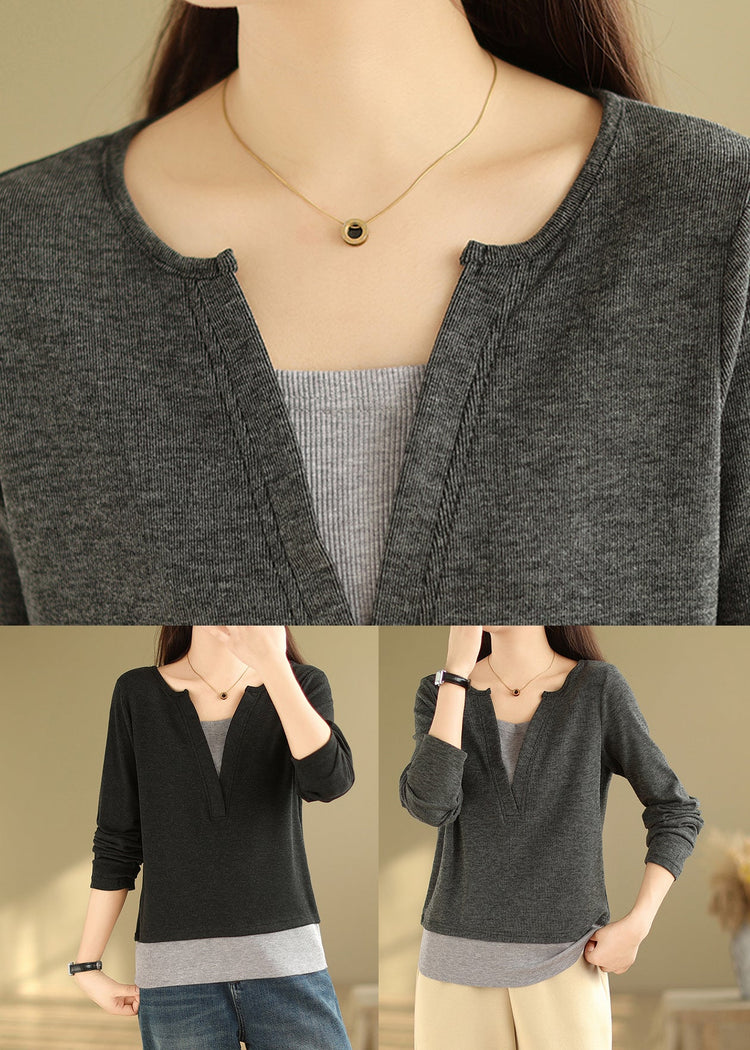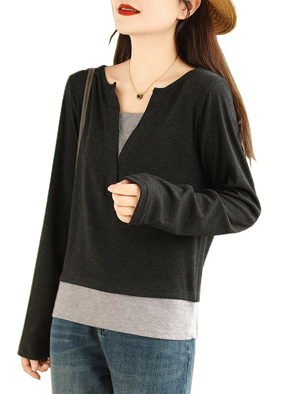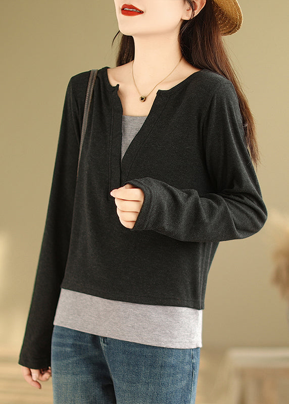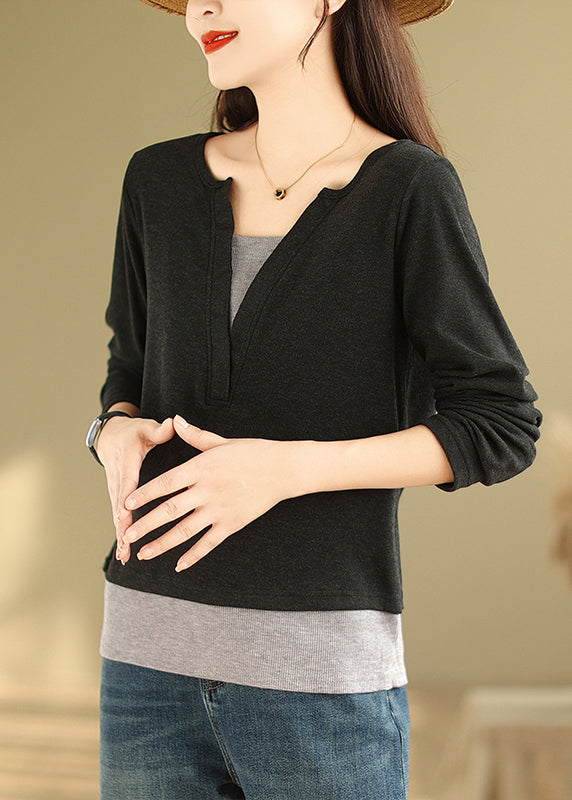 Black Patchwork Versatile Cotton T Shirts V Neck False Two Pieces Fall