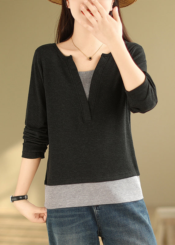 Black Patchwork Versatile  Cotton T Shirts V Neck False Two Pieces Fall