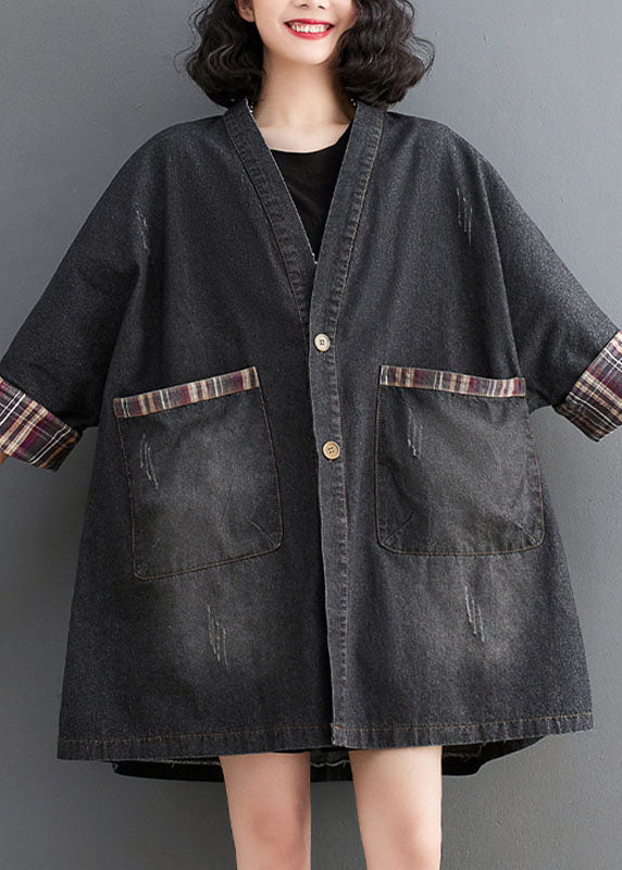 Black Pockets Button Low High Design Denim Trench Coat Fall