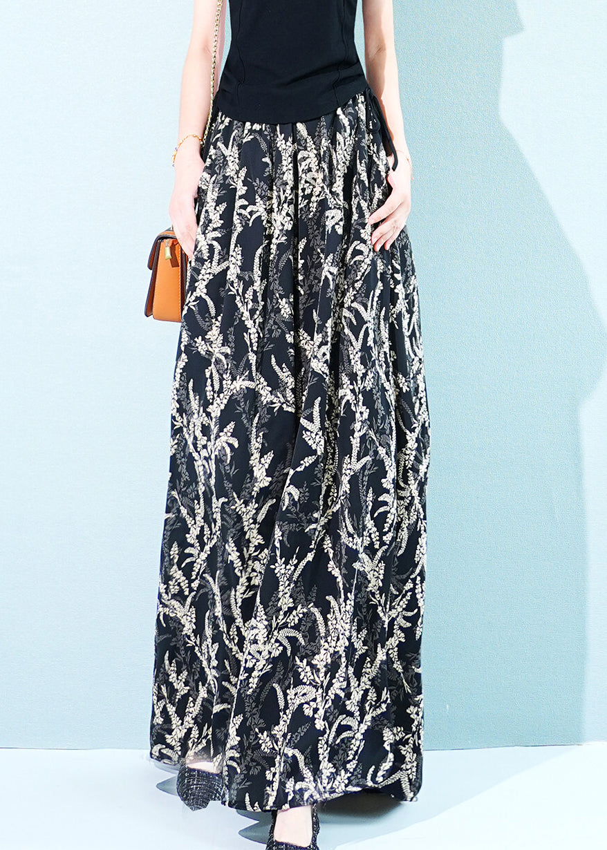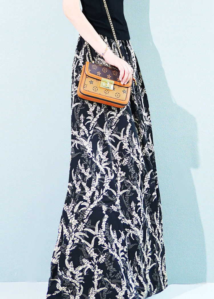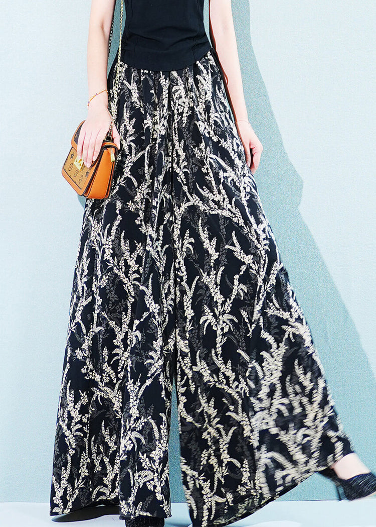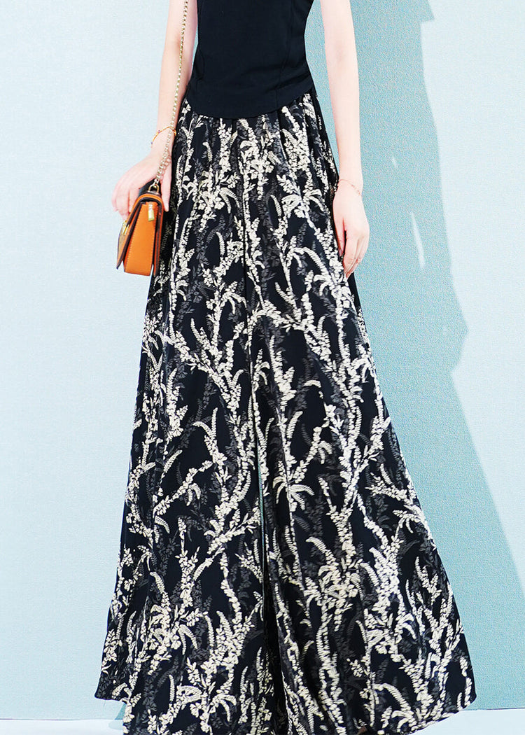 Black Pockets Elastic Waist Ice Silk Wide Leg Pants Print Summer