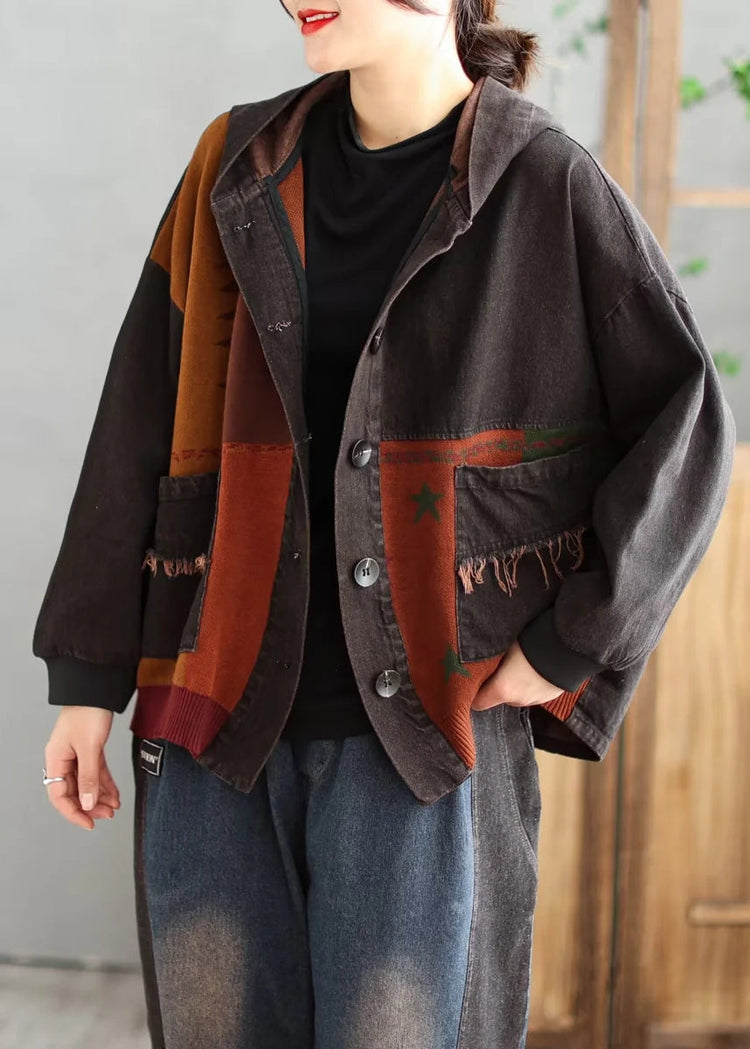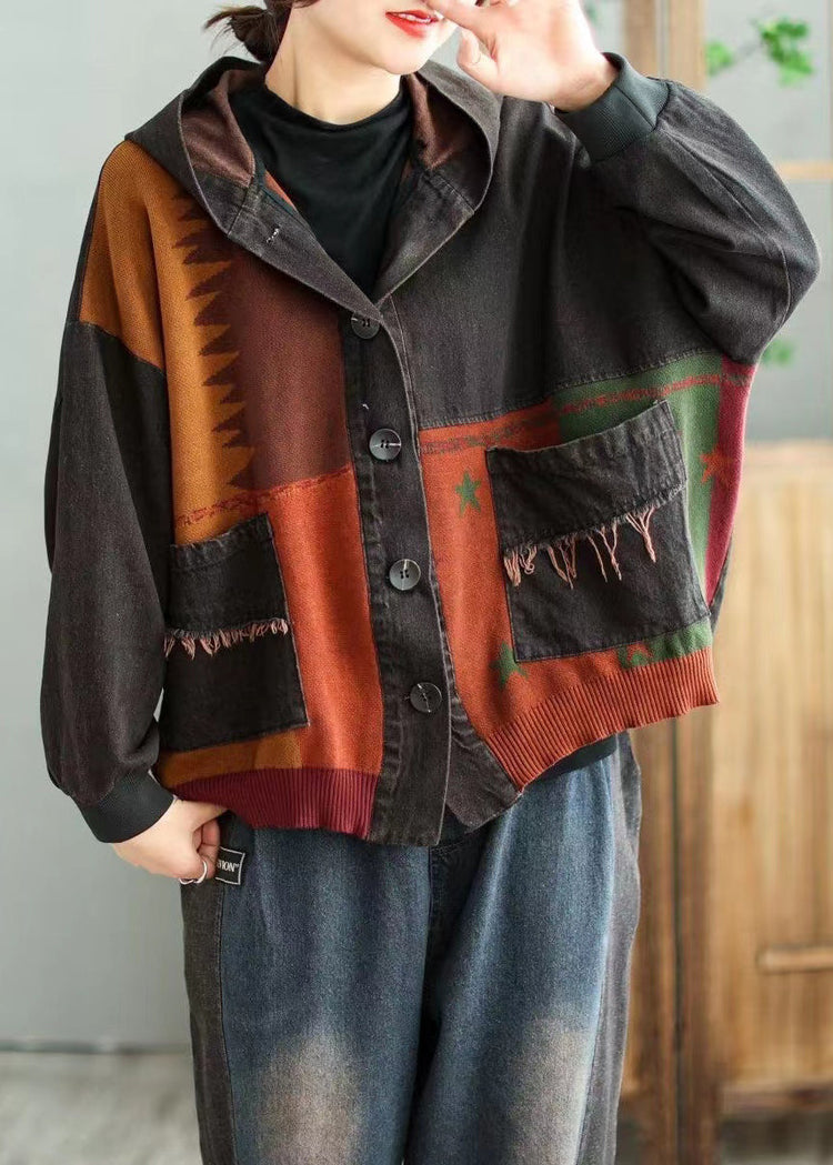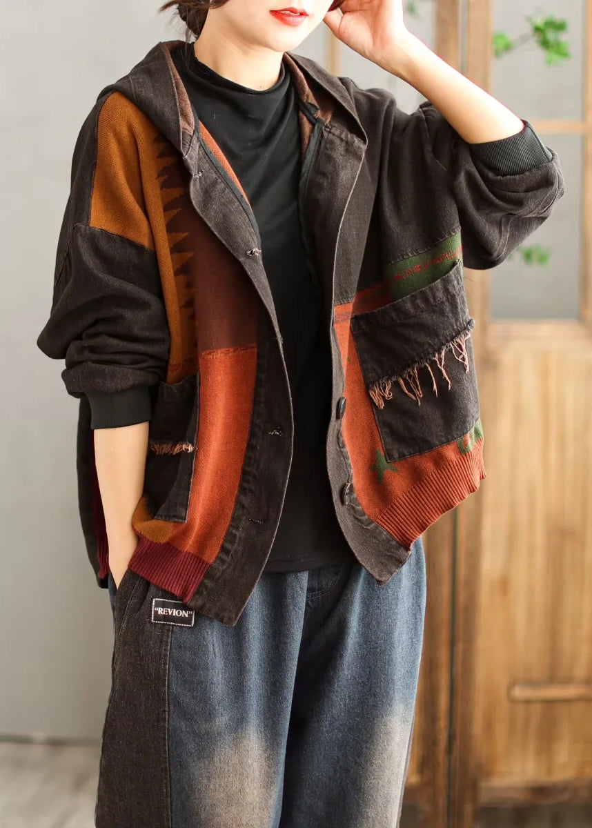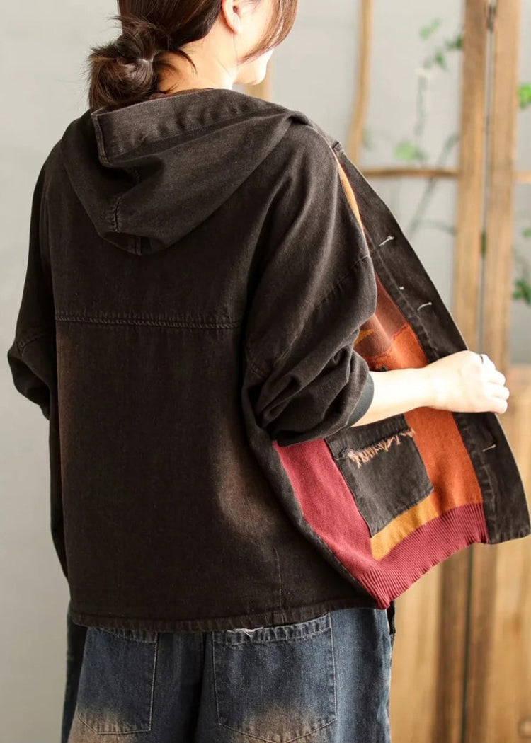 Black Pockets Patchwork Original Denim Coat Hooded Spring