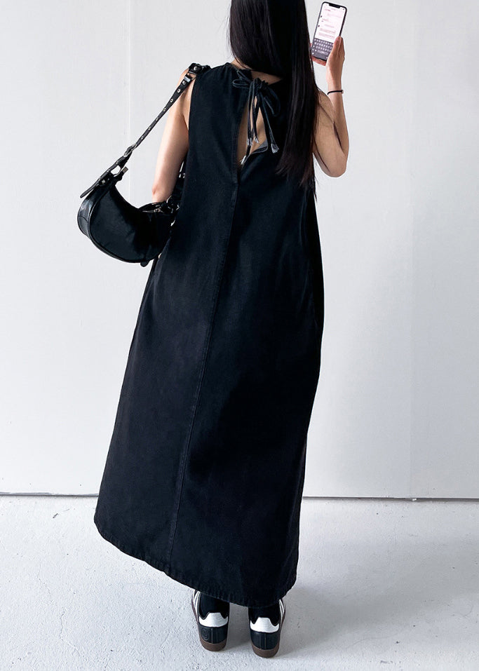 Black Pockets Solid Long Dress O Neck Denim Summer