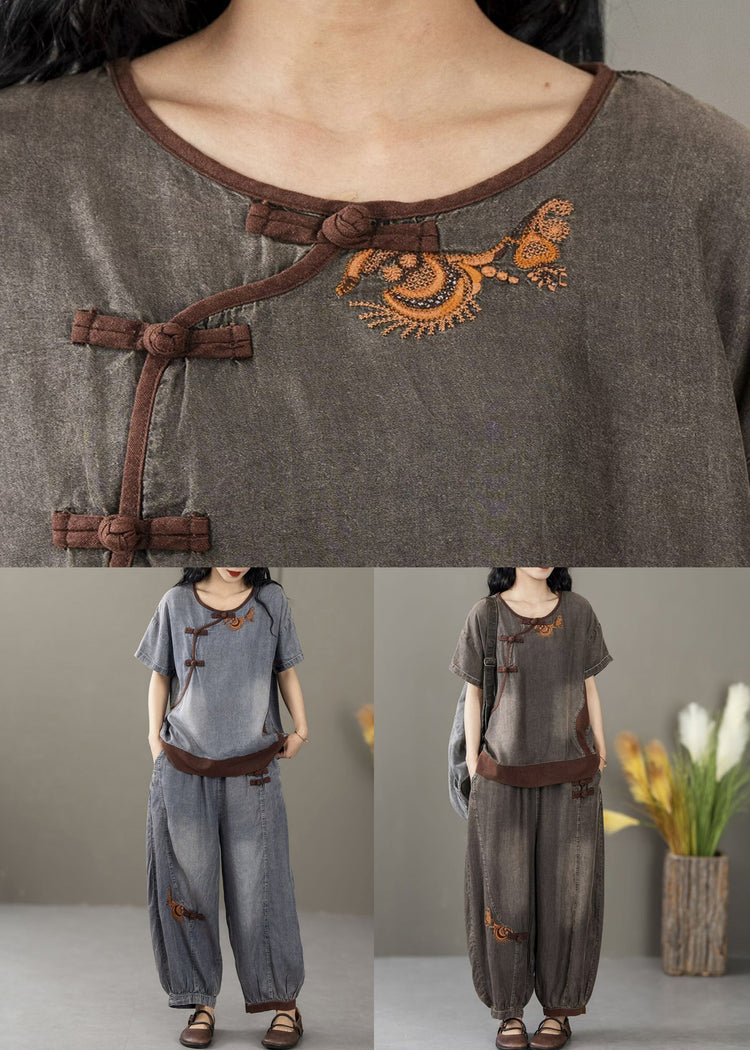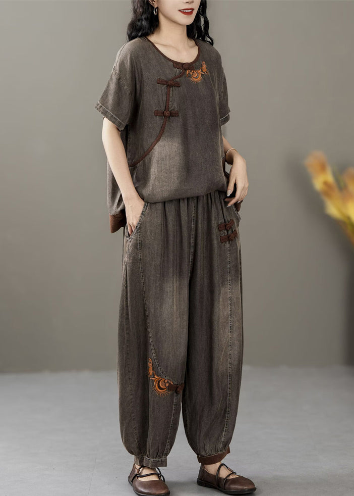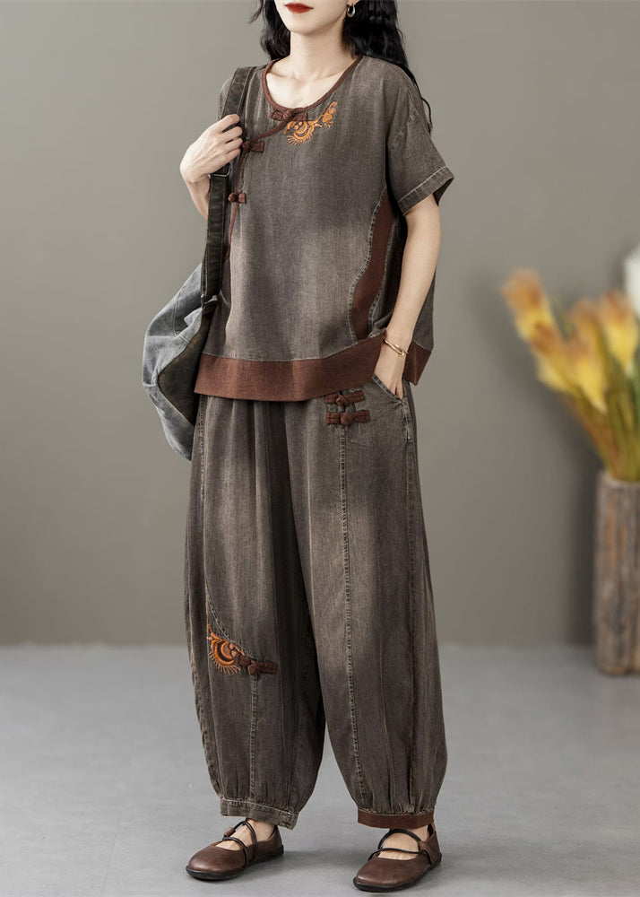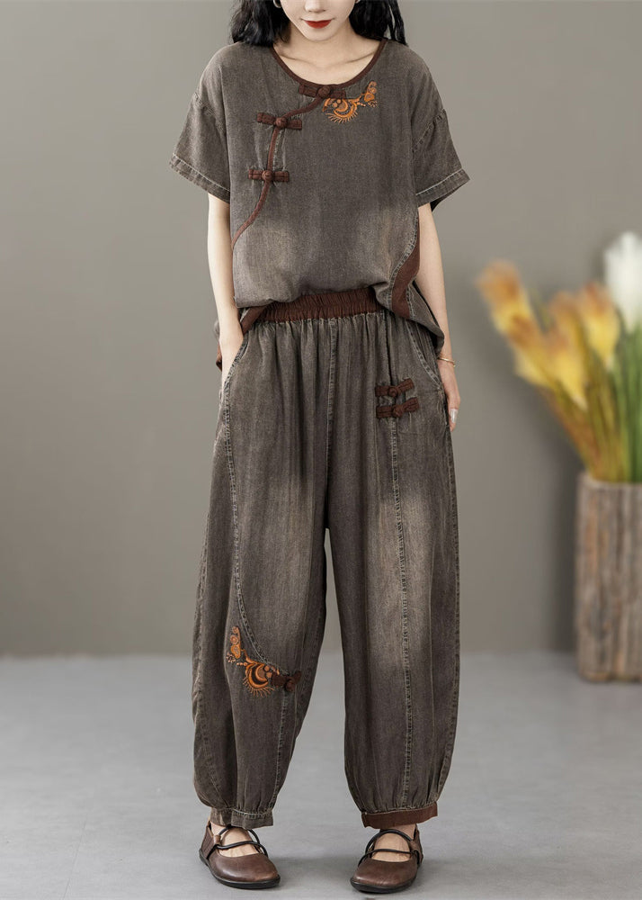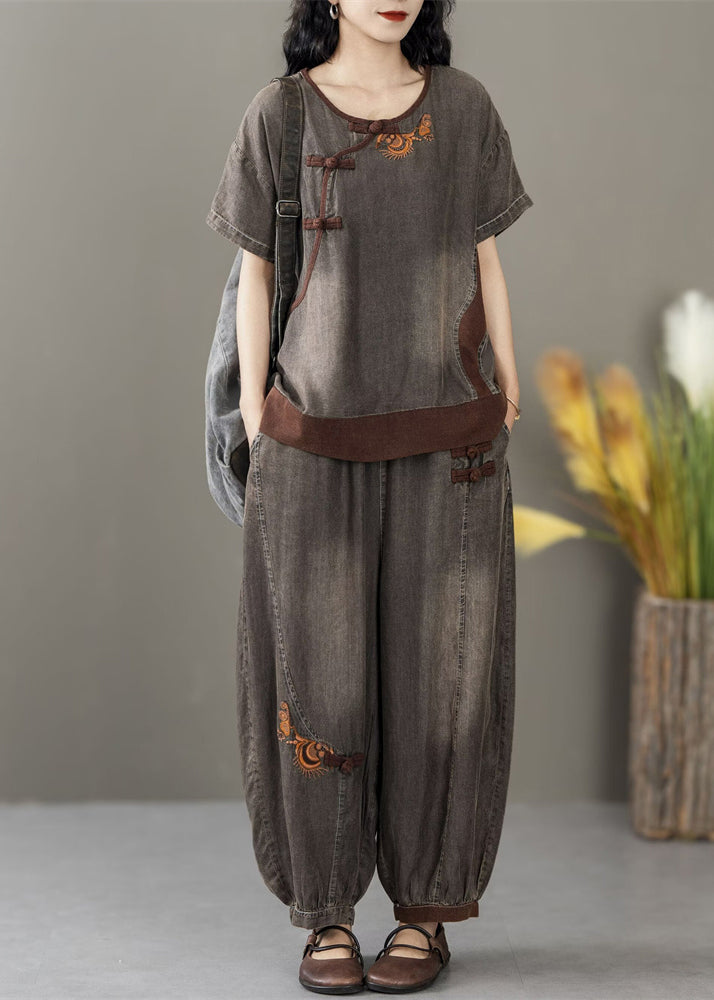 Black Pockets Waist Patchwork Denim Two Pieces Set O Neck Short Sleeve