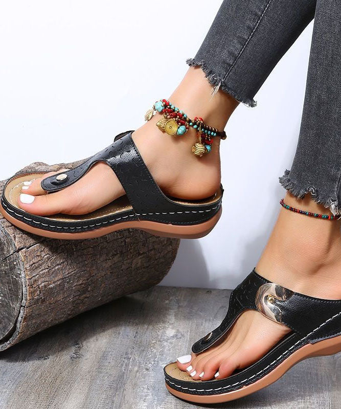 Black Sequined Rivet Splicing Beach Wedge Thong Sandals
