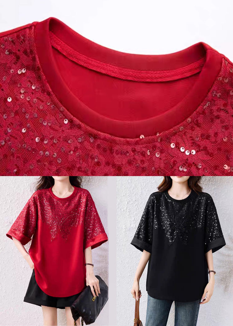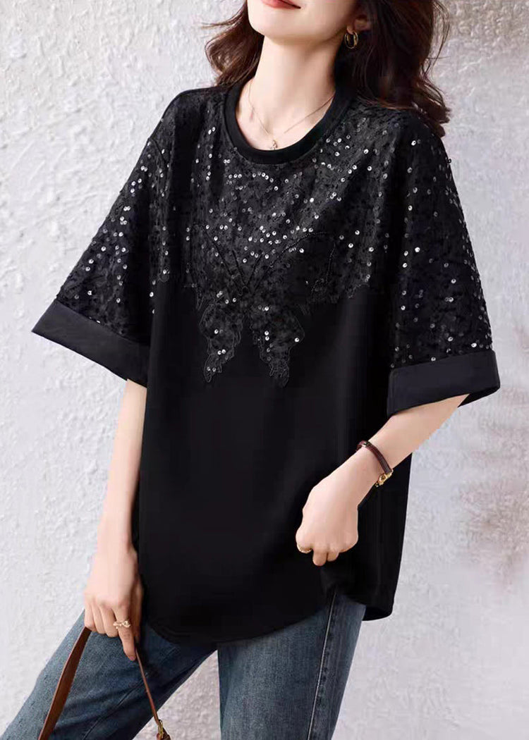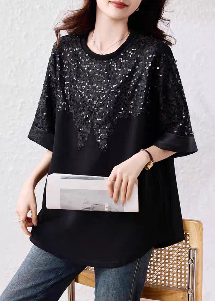 Black Sequins Cotton T Shirt O Neck Half Sleeve