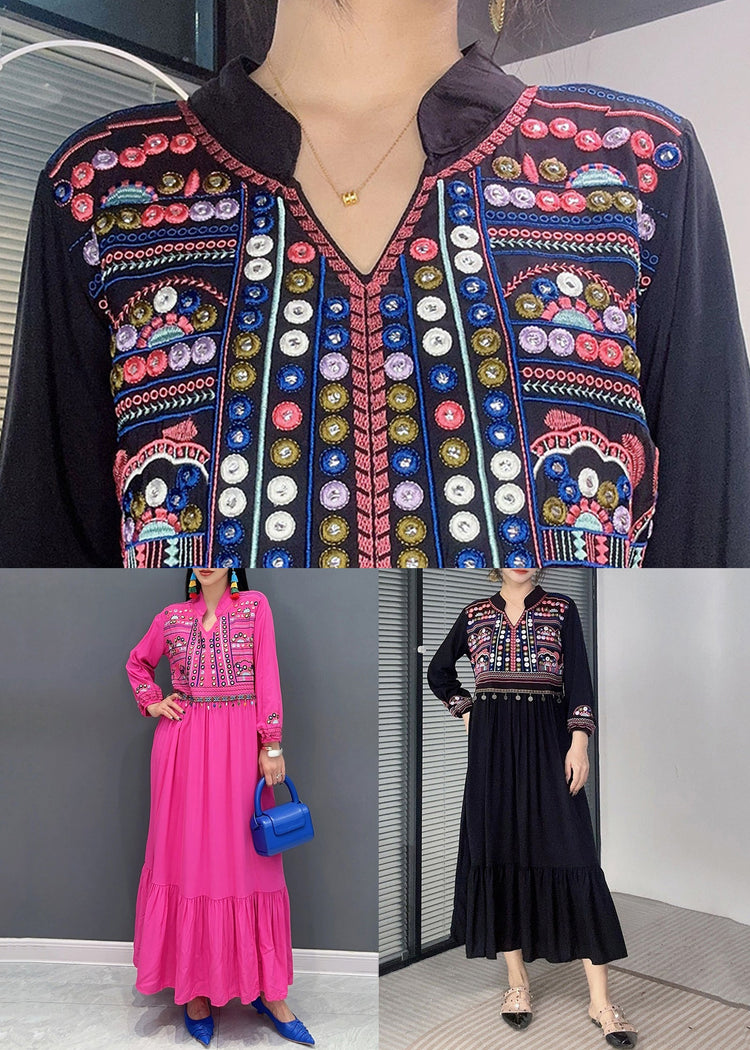 Black Tasseled Solid Cotton Long Dress Embroidered Long Sleeve