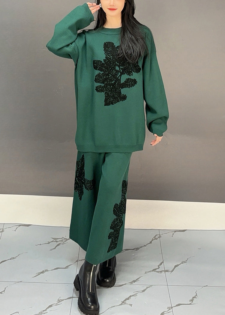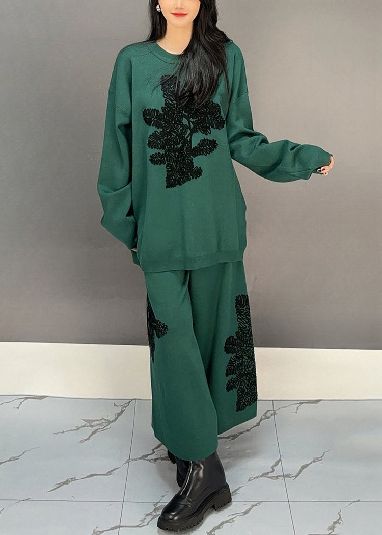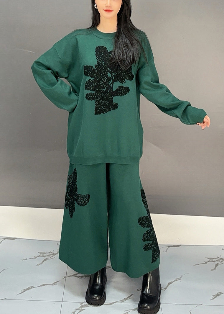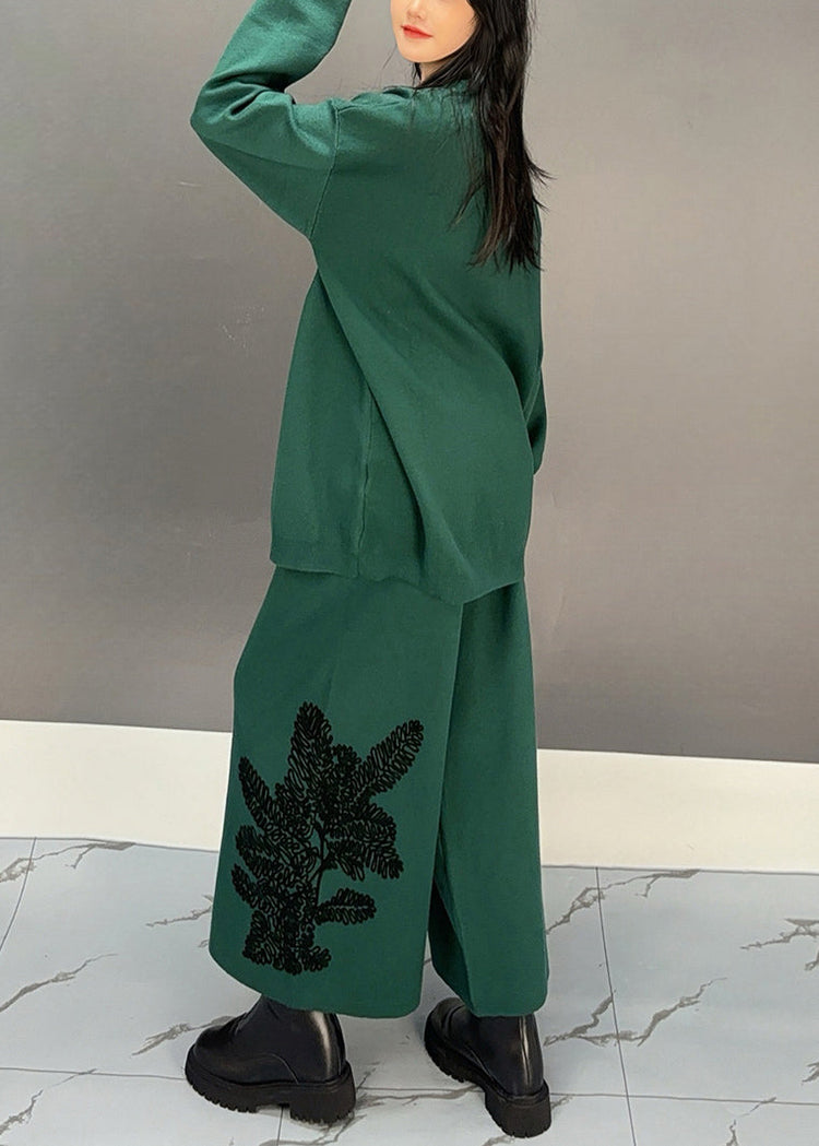 Blackish Green Sweatshirt And Wide Leg Pants Cotton Two Piece Set Embroidered Fall