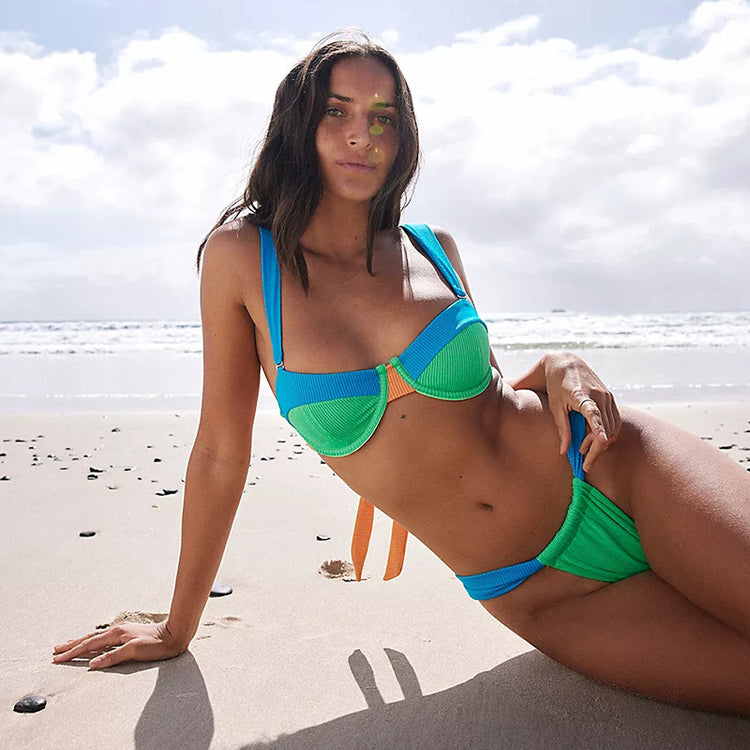 Blue Green Patchwork Contrasting Pit Stripe Bikini
