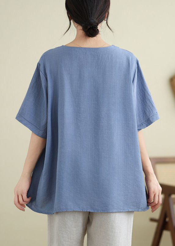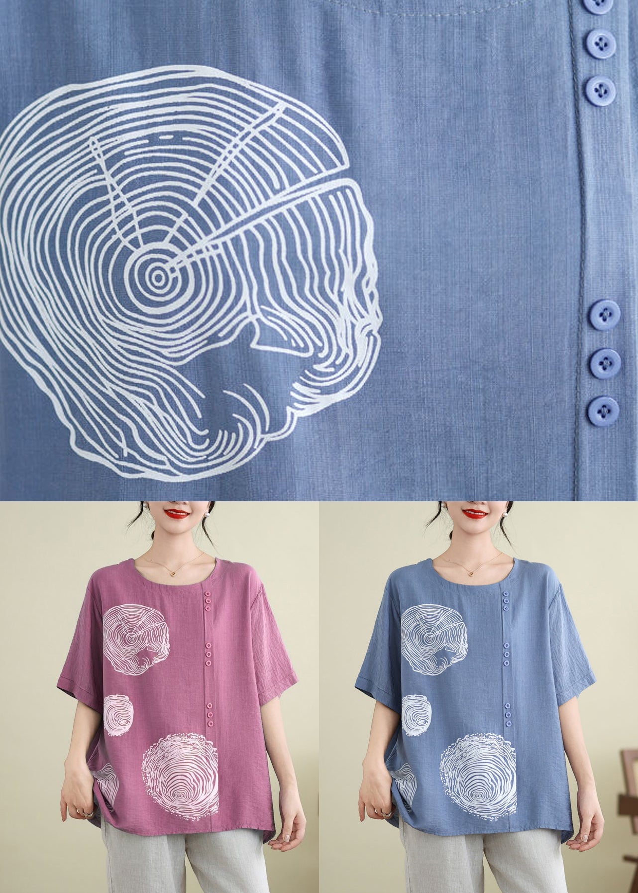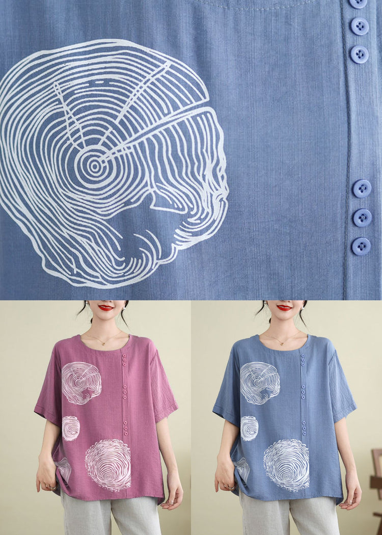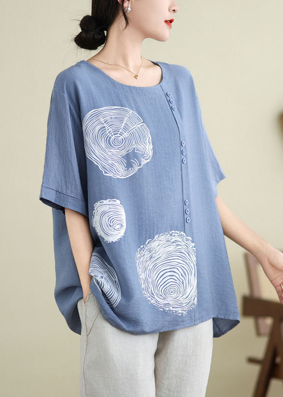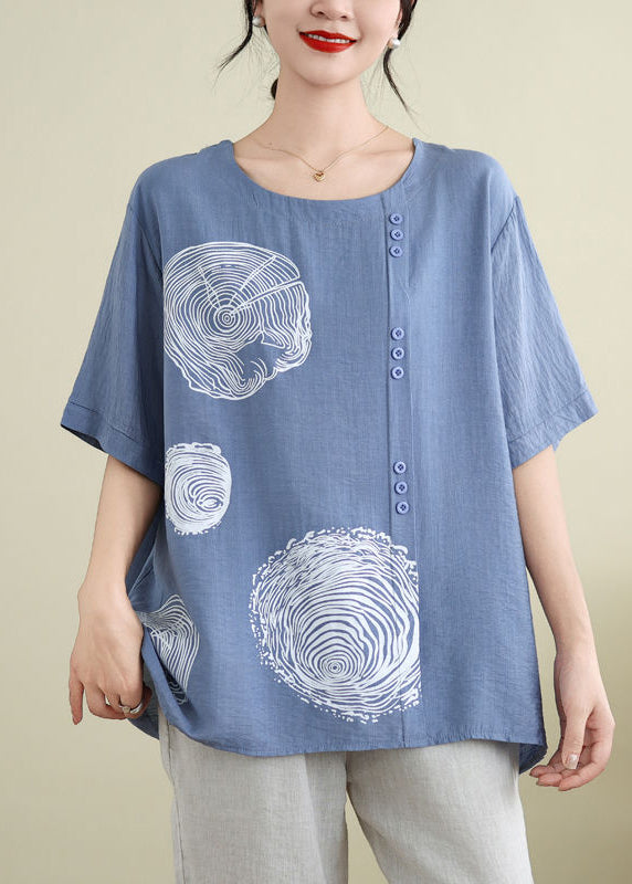 Blue O-Neck Print Ice Silk T Shirt Summer