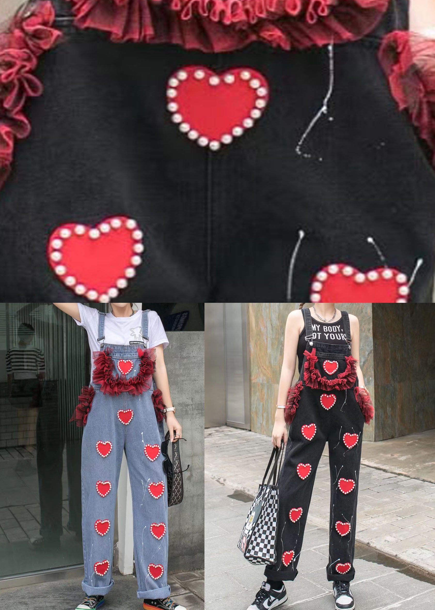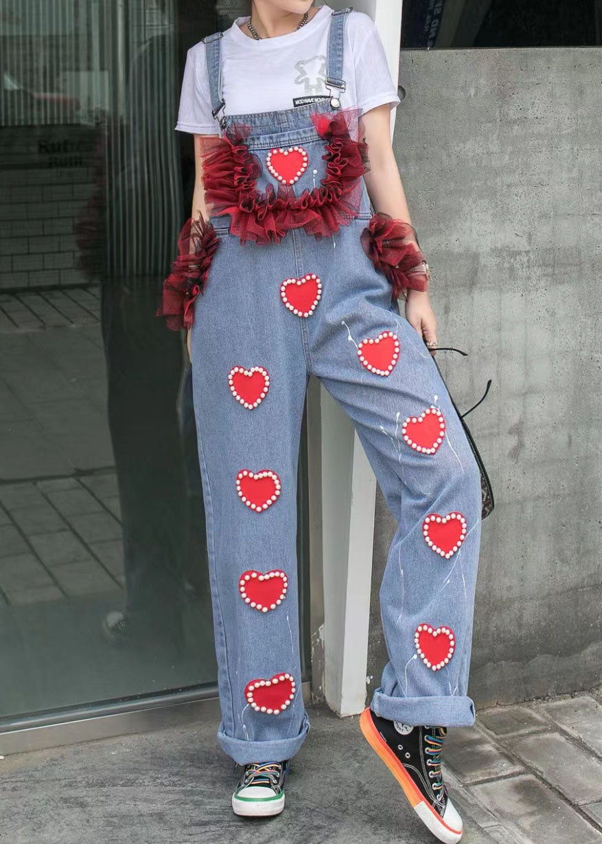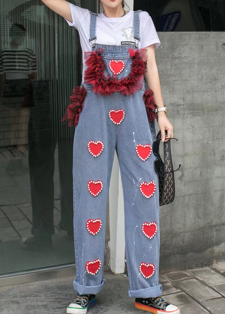 Blue Patchwork Spaghetti Strap Denim Jumpsuits Tulle Ruffled Heart Nail Bead Summer