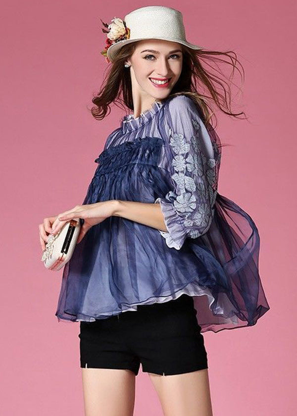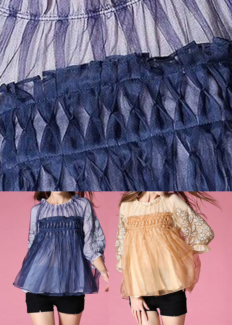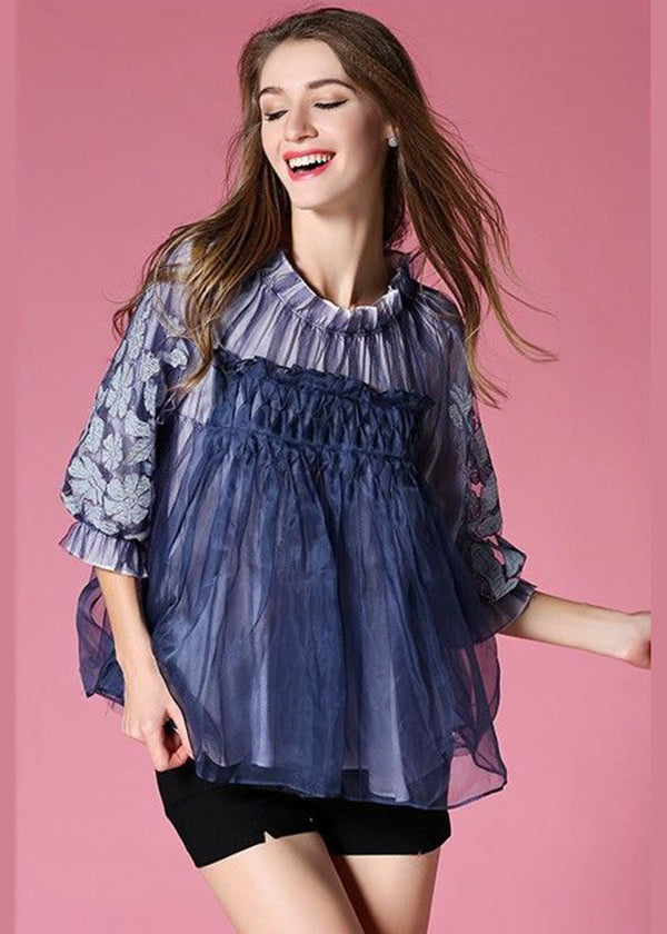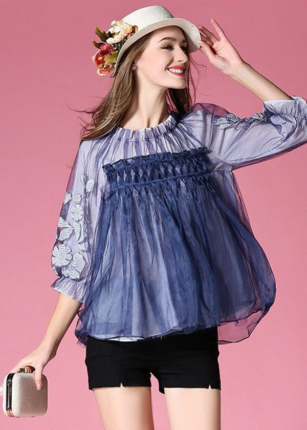 Blue Patchwork Tulle Shirt Embroidered Wrinkled Spring