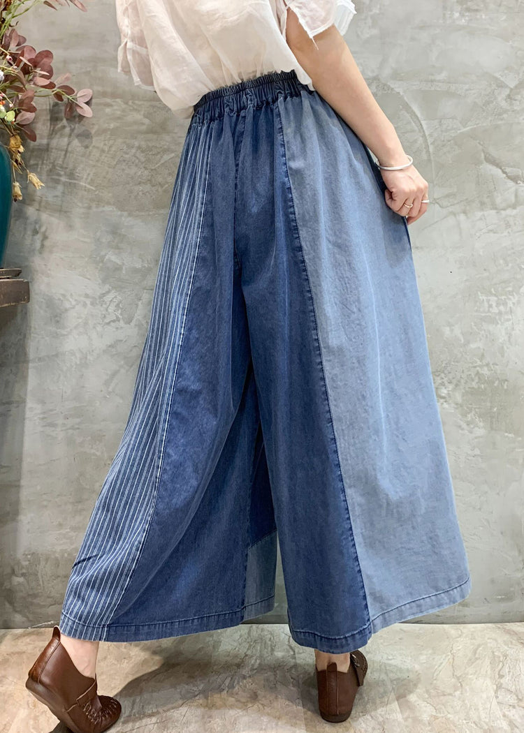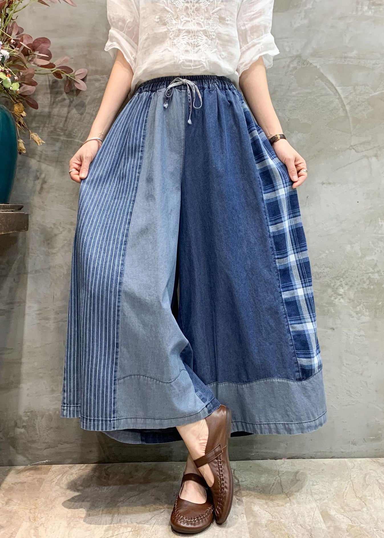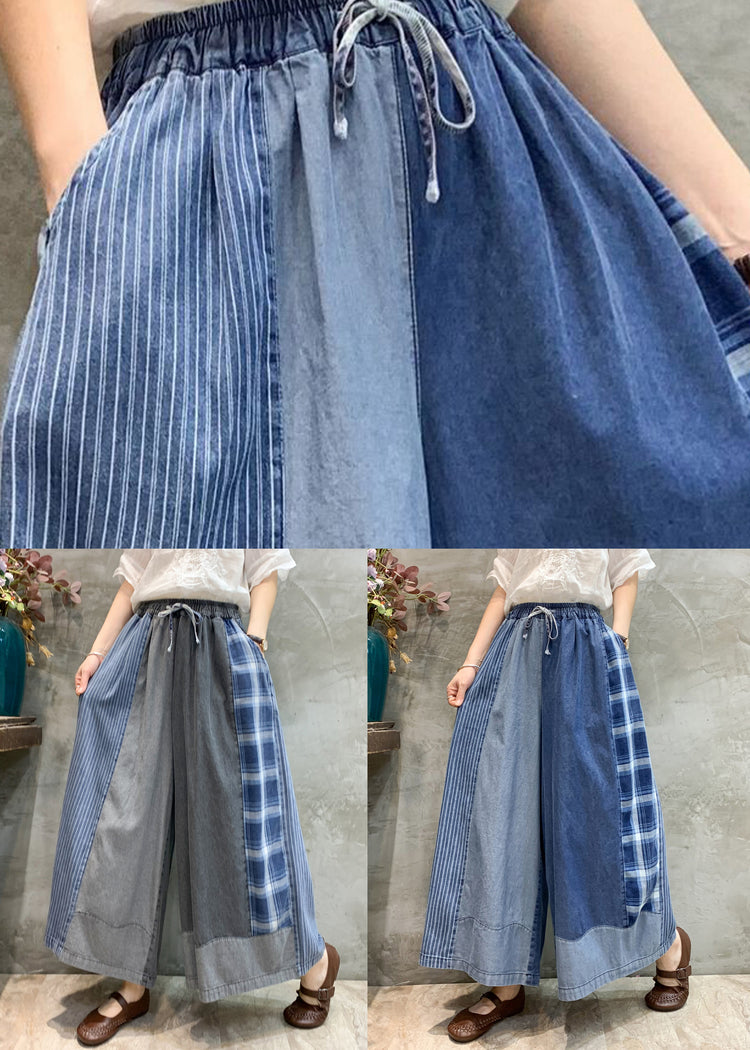 Blue Plaid Elastic Waist Patchwork Denim Loose Pants Pockets