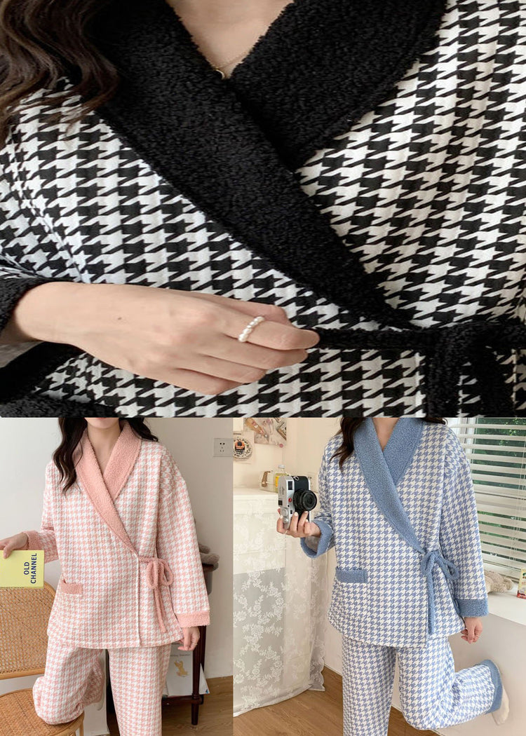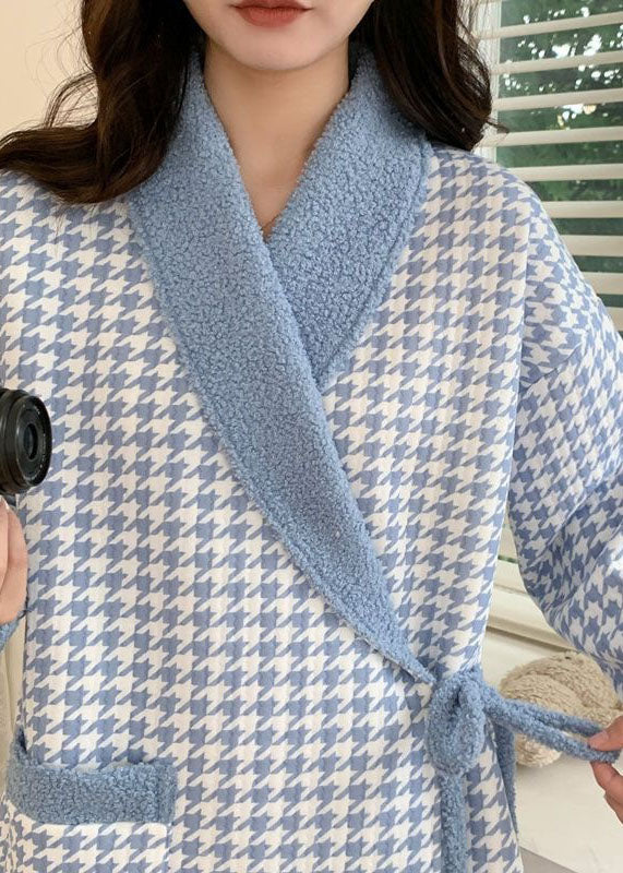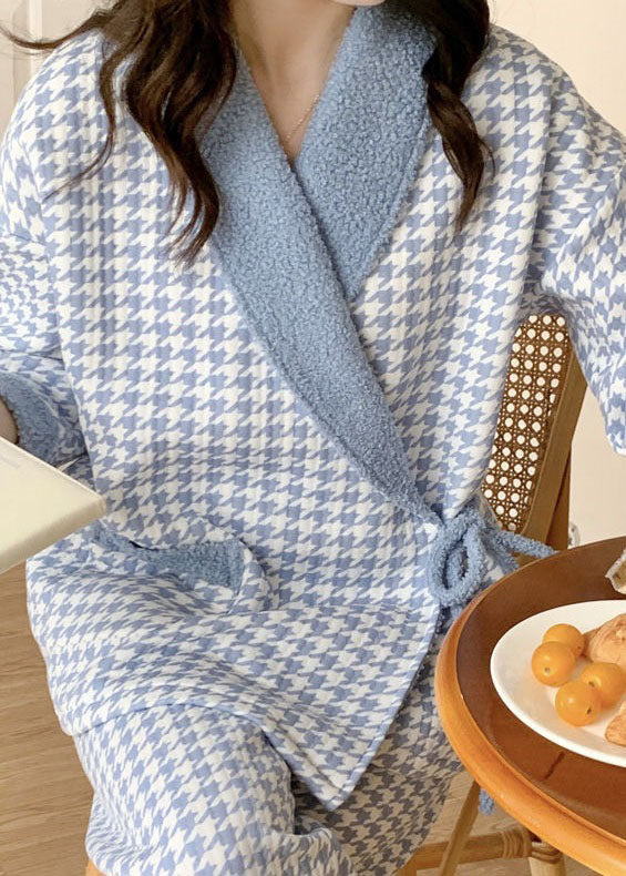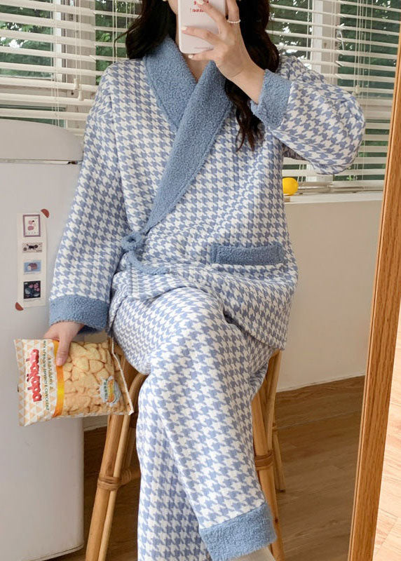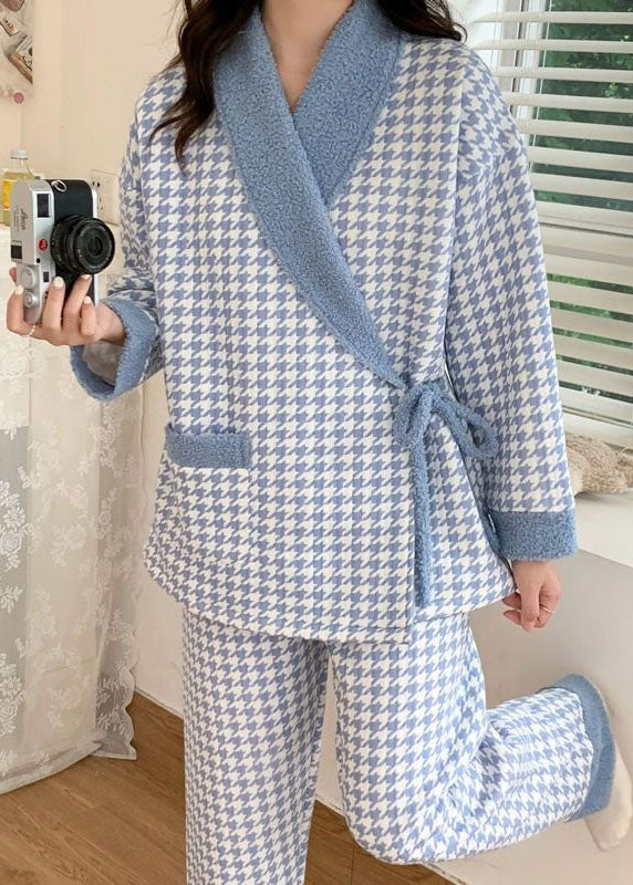 Blue Plaid Thick Cotton Pajamas Two Piece Set Peter Pan Collar Spring