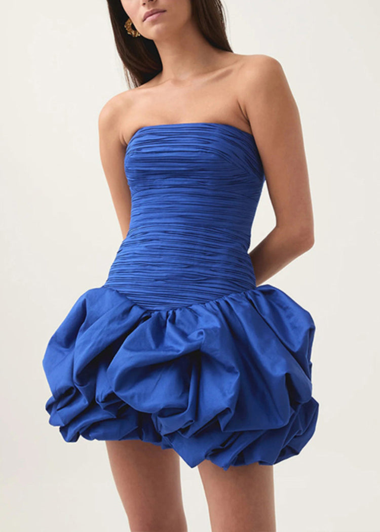 Blue Wrinkled Solid Cotton Mid Dress Strapless Summer