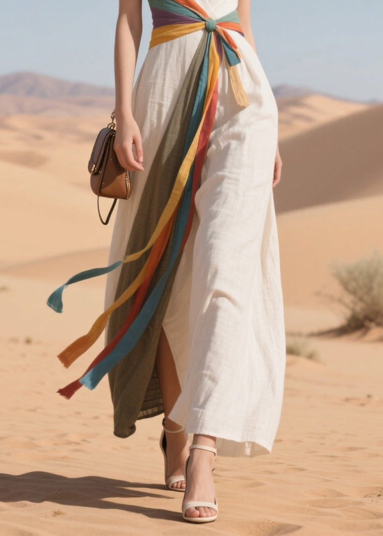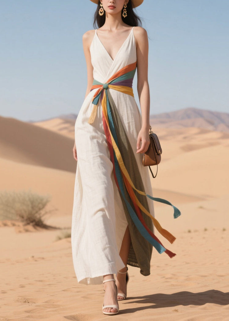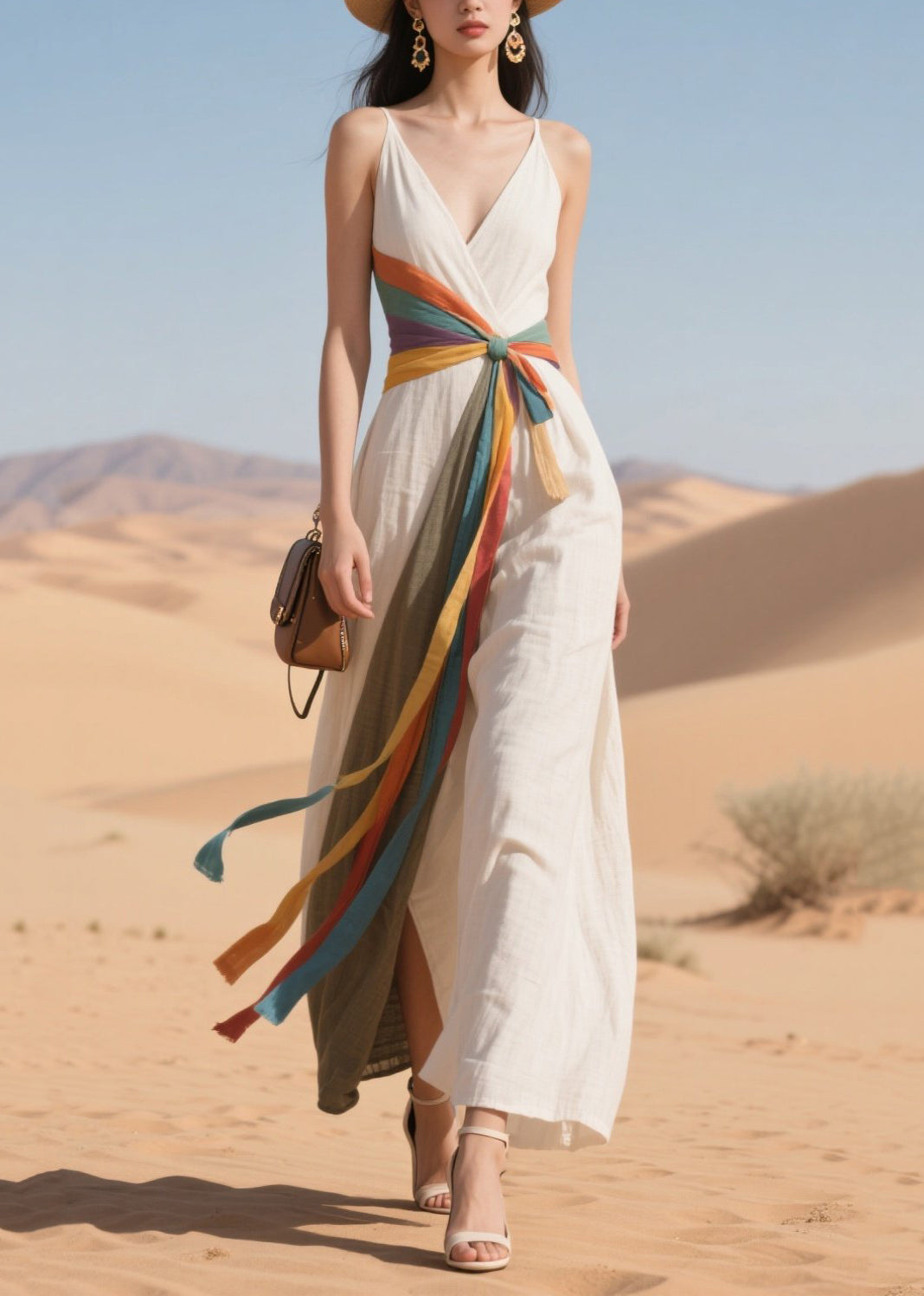 Bobo White V Neck Patchwork Side Open Cotton Holiday Dress Summer