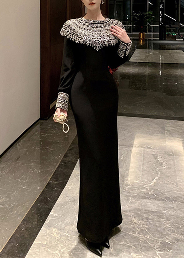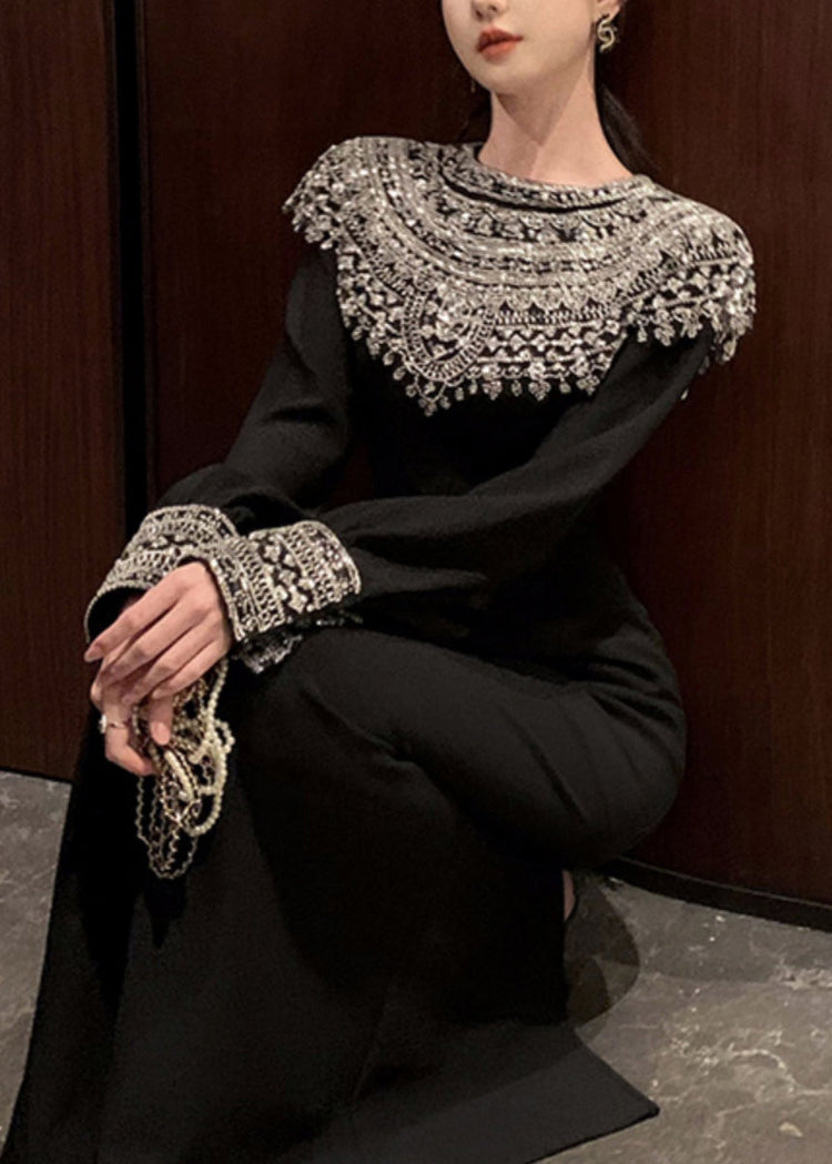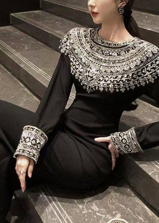 French Black O Neck Zircon Patchwork Cotton Party Dresses Spring