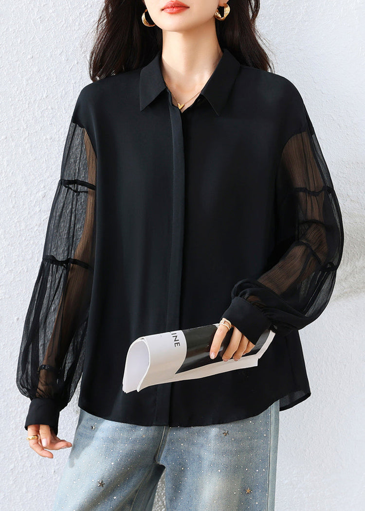French Black Peter Pan Collar Patchwork Tulle Chiffon Tops Fall
