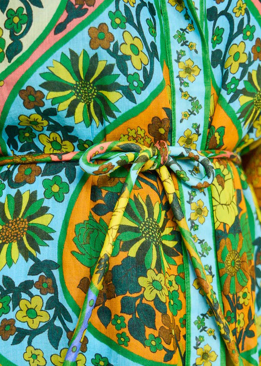 French Sky Blue Print Tie Waist Linen Shirts Dress Long Sleeve