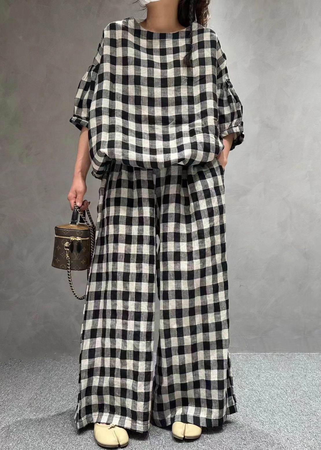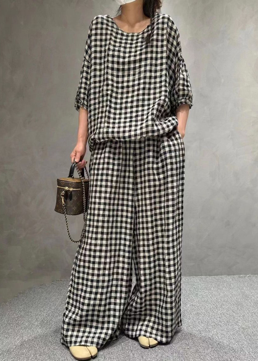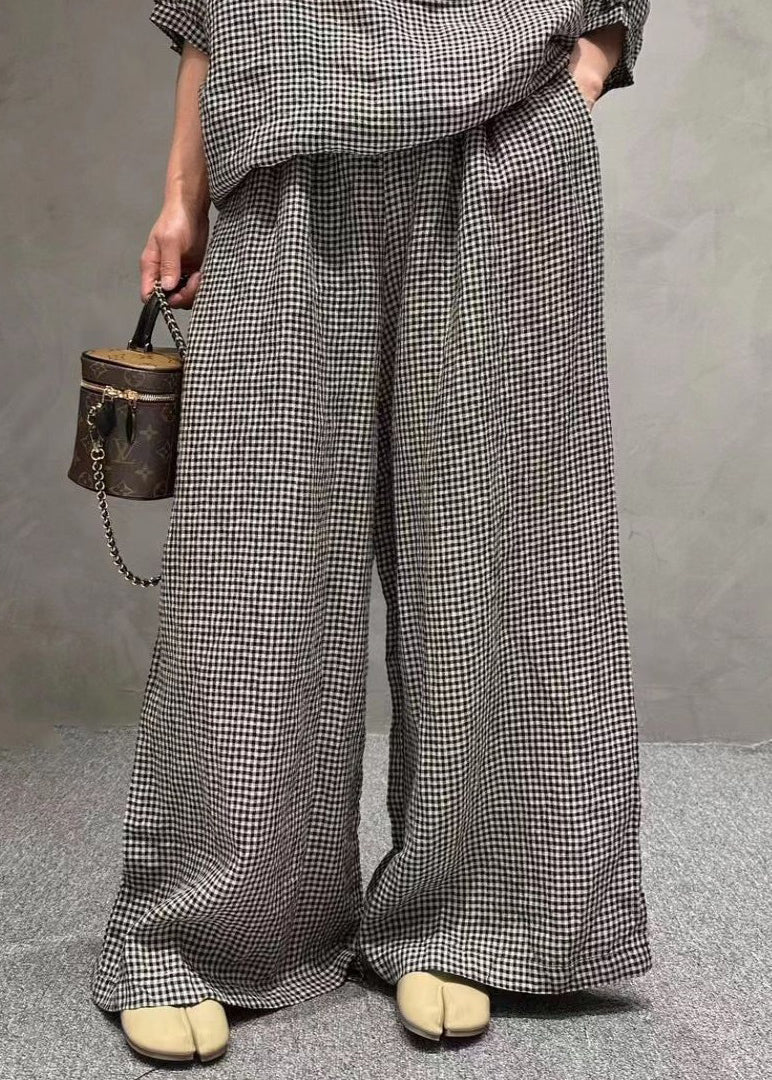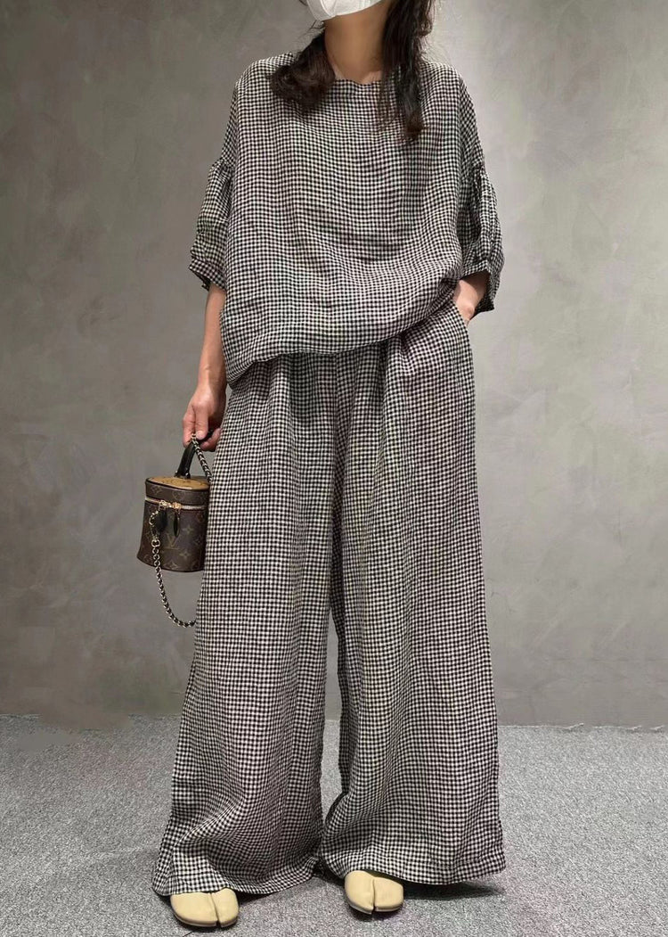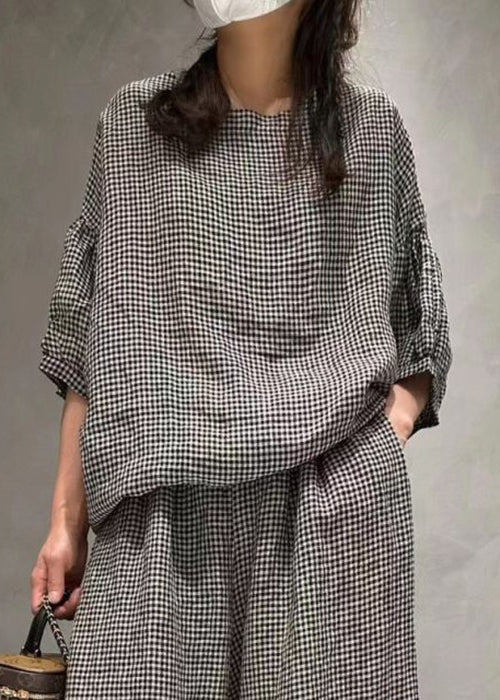 French Small Plaid O-Neck Pockets Cotton Two Pieces Set Half Sleeve