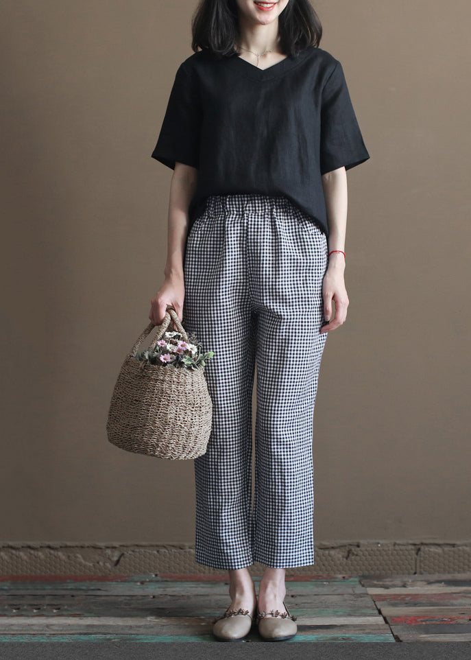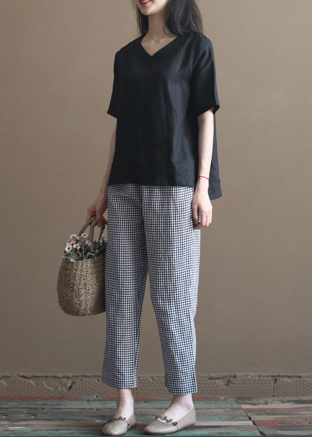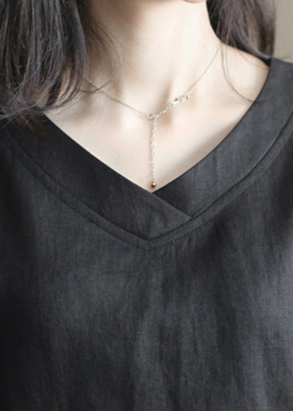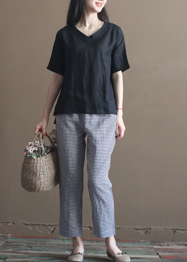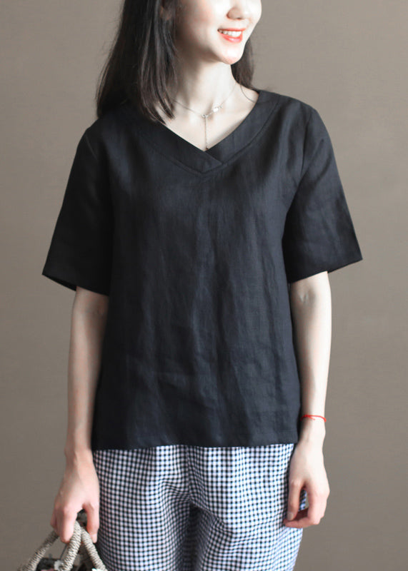 French Solid Black V Neck Side Open Linen Tank Tops Half Sleeve