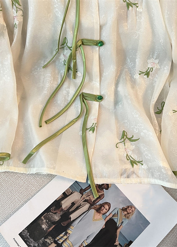 French White Chinese Button Embroidered Chiffon Shirt Long Sleeve