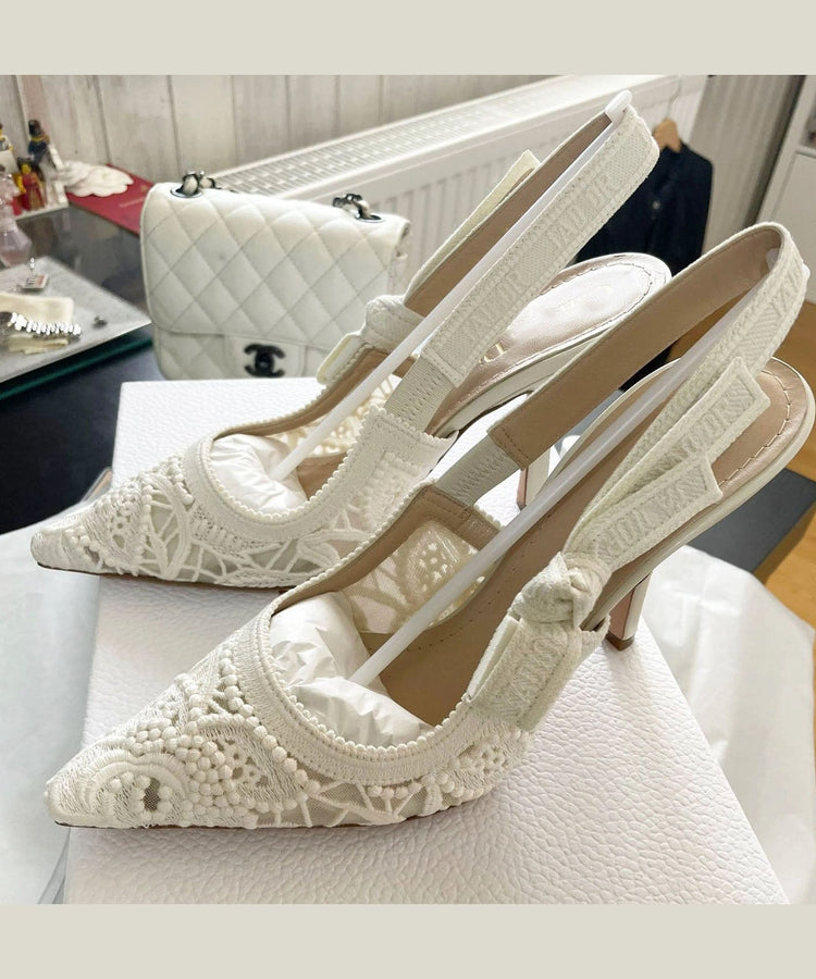 French White Embroidered Lace High Heeled Sandals
