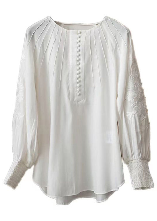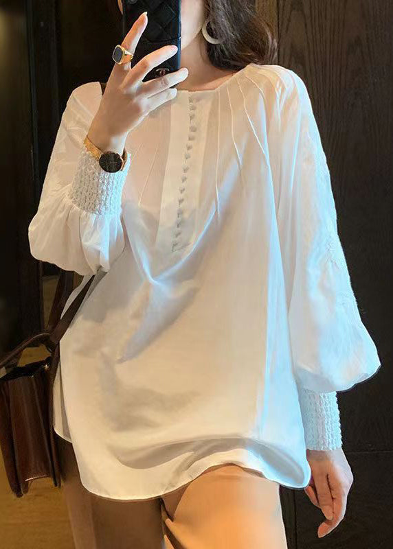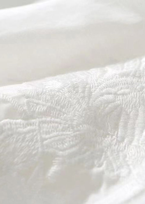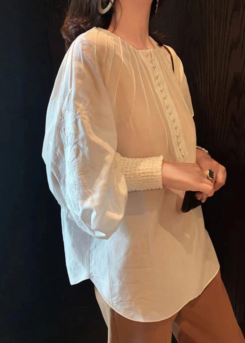 French White Embroidered Button Cotton Shirts Lantern Sleeve