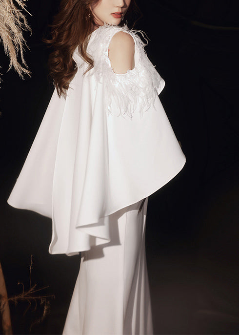 French White Feathered Haute Couture Mermaid Gown Off The Shoulder