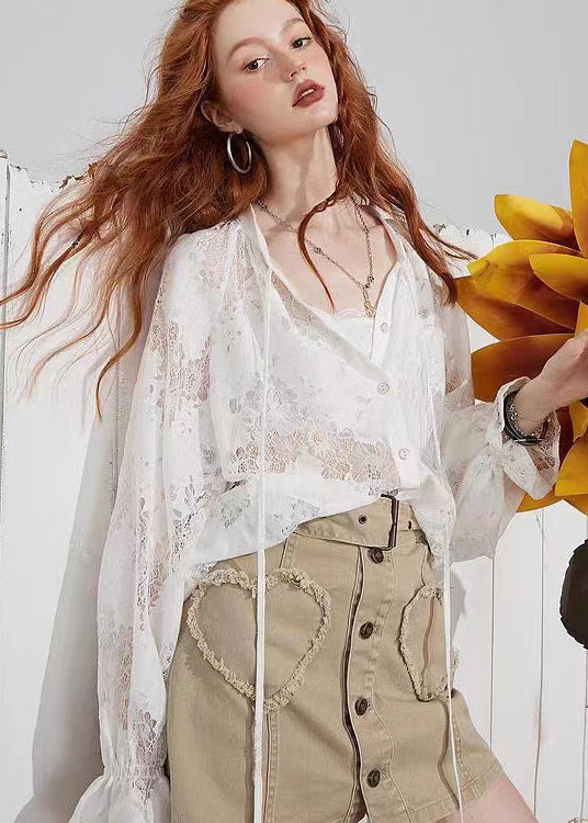 French White Hollow Out Patchwork Lace Shirt Tops Fall