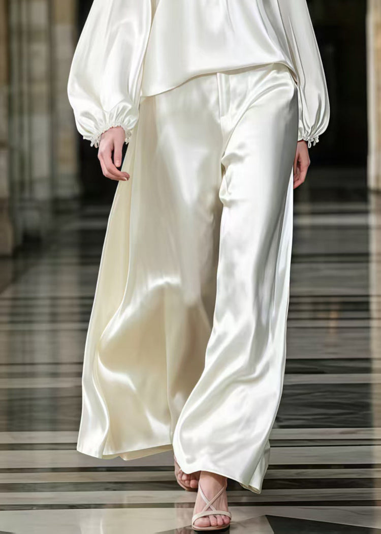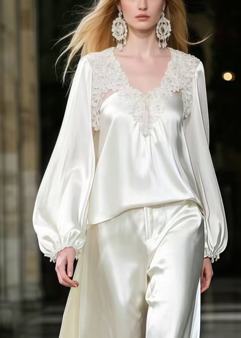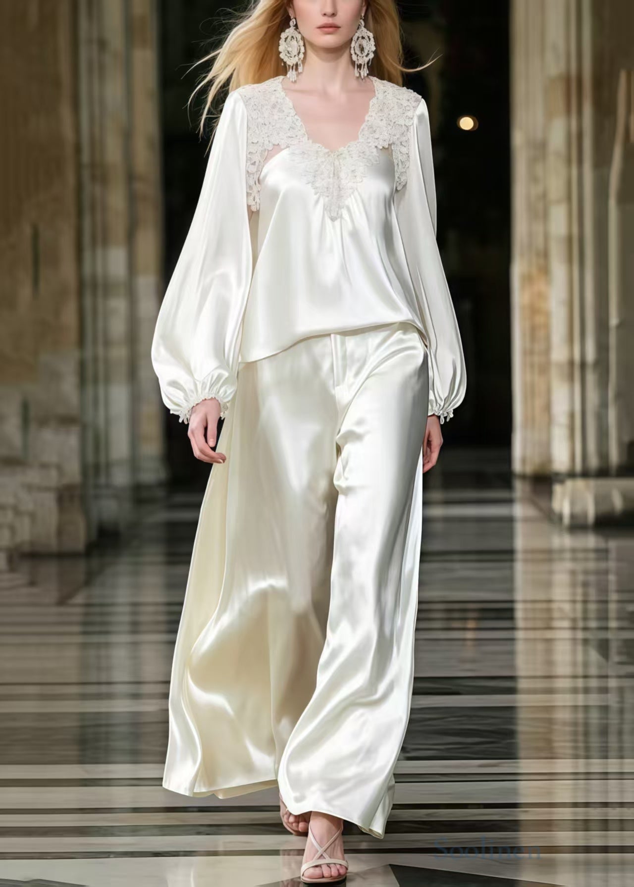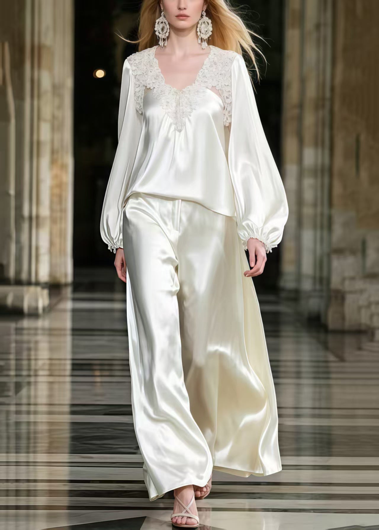French White Lace Patchwork Draping Silk Two Piece Set Women Clothing Spring