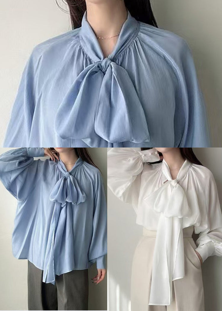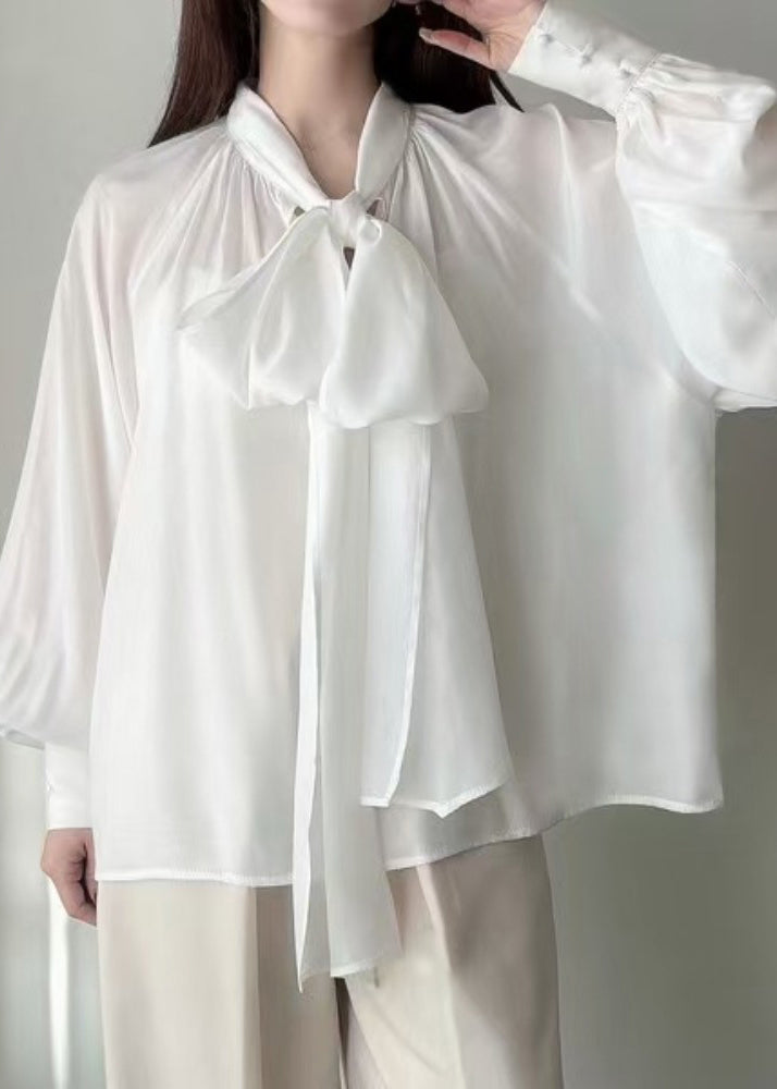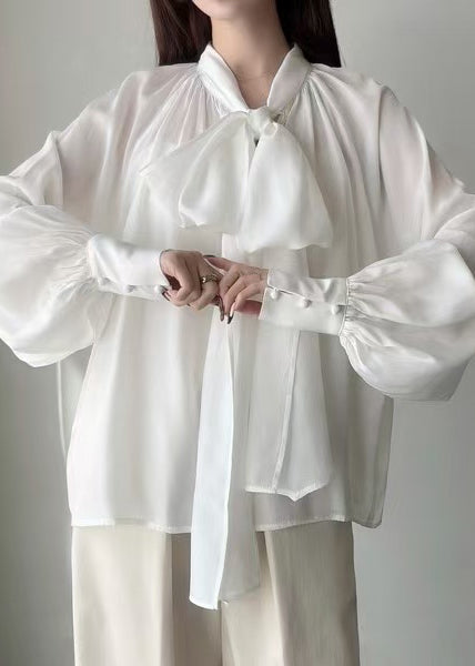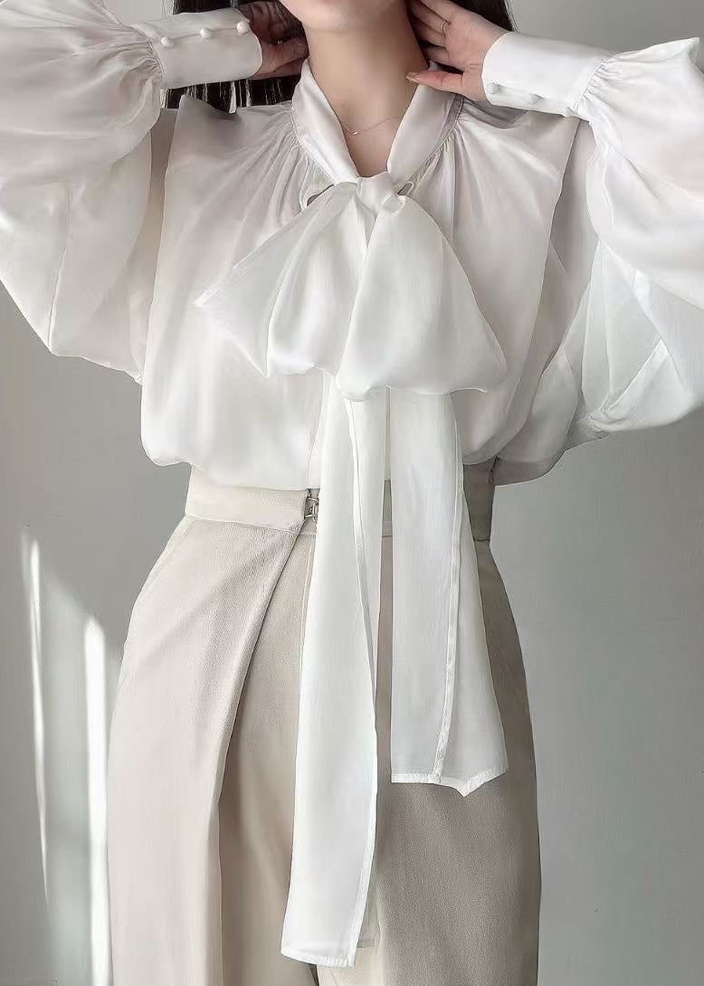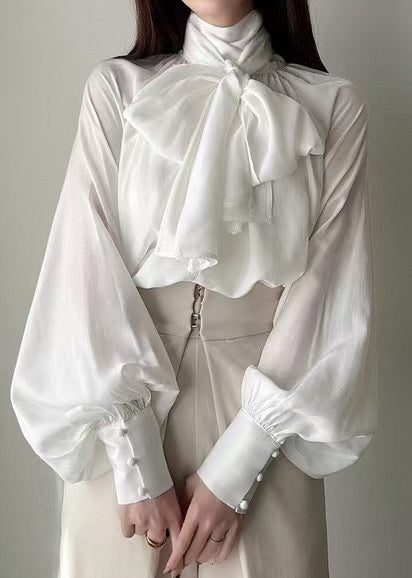French White Neck Waist Silk Shirt Tops Lantern Sleeve