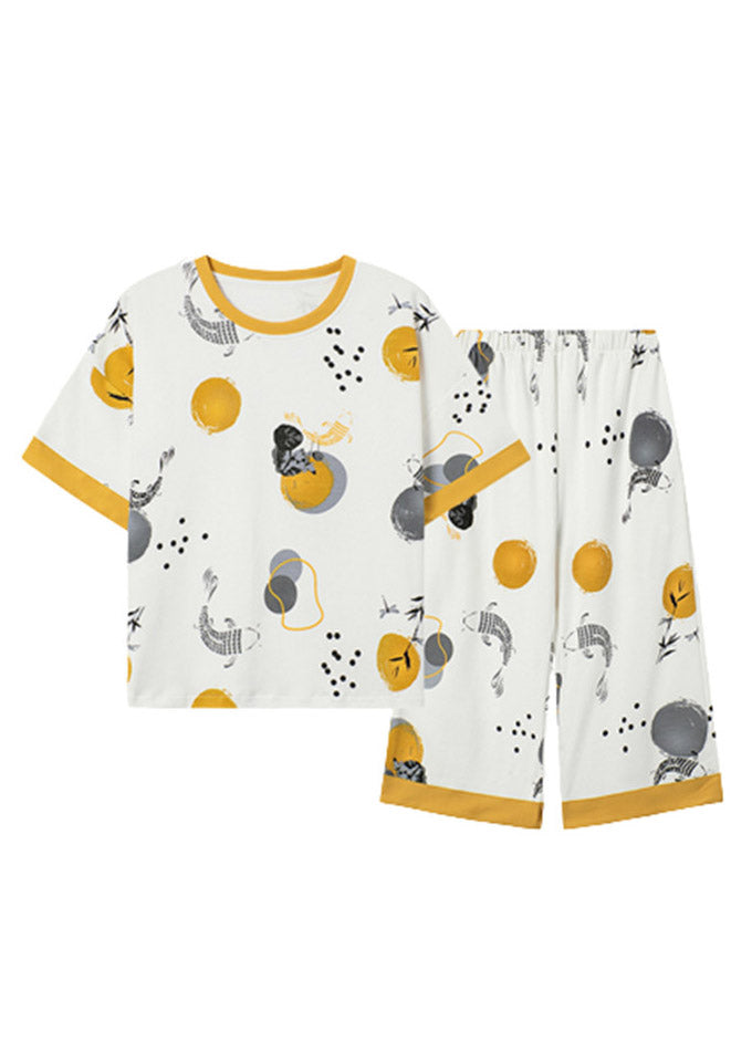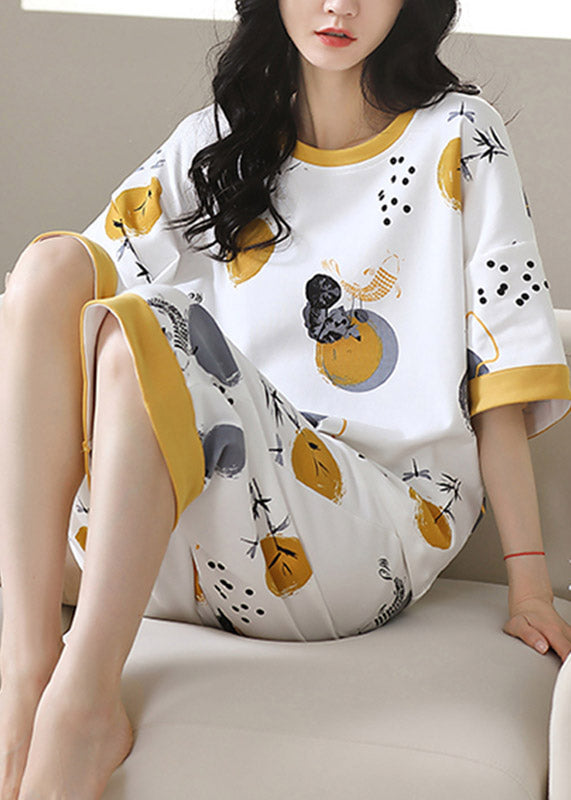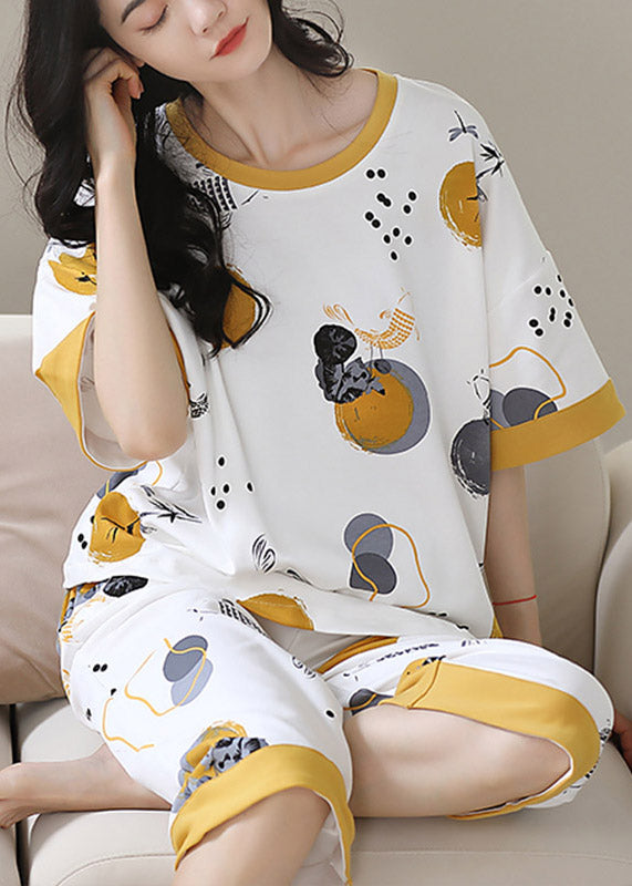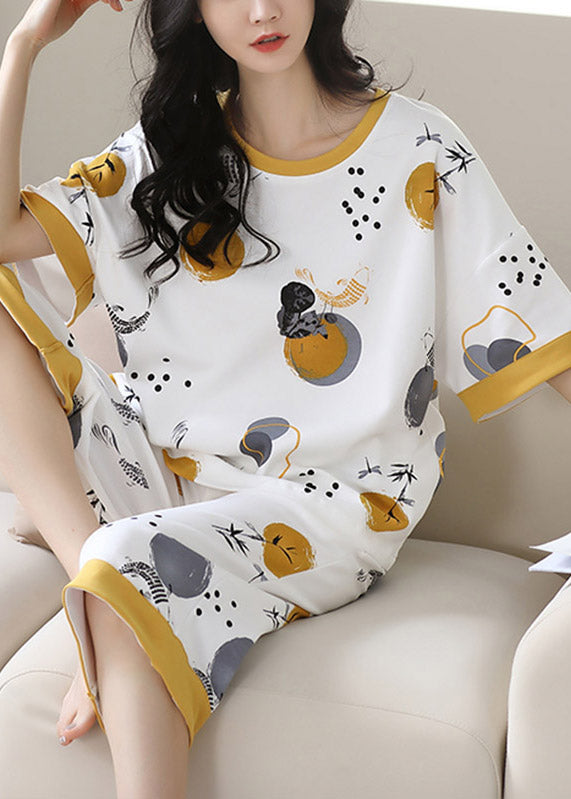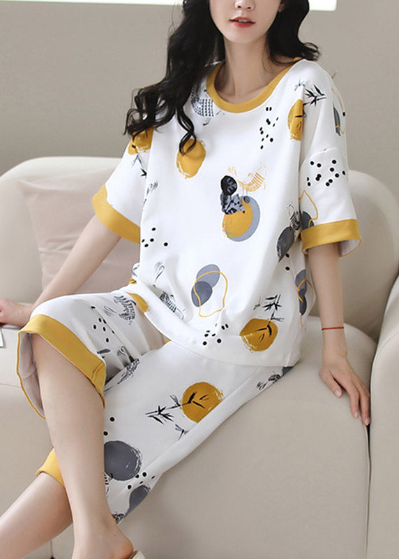 French White O-Neck Print Cotton Pajamas Two Piece Set Summer
