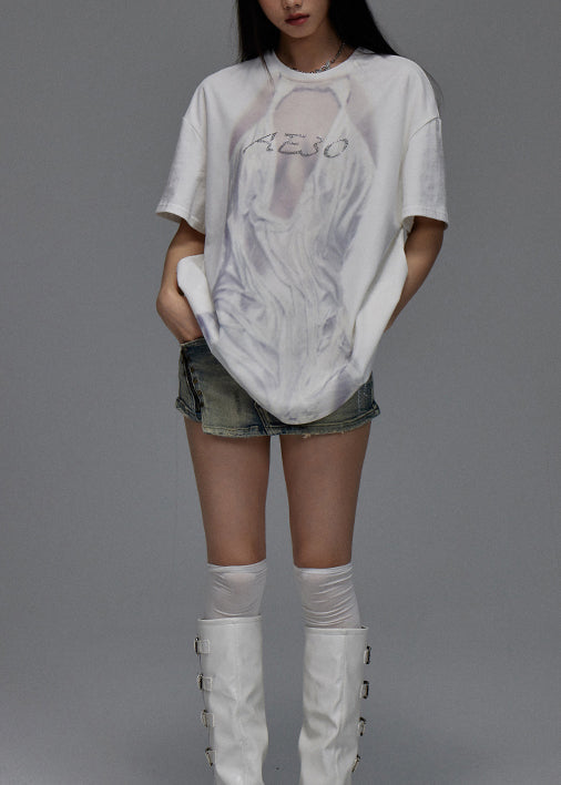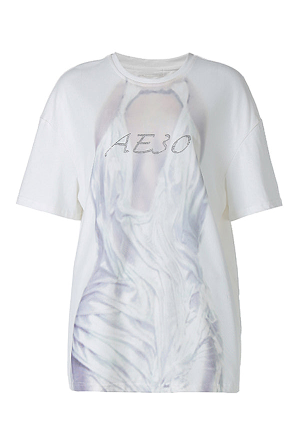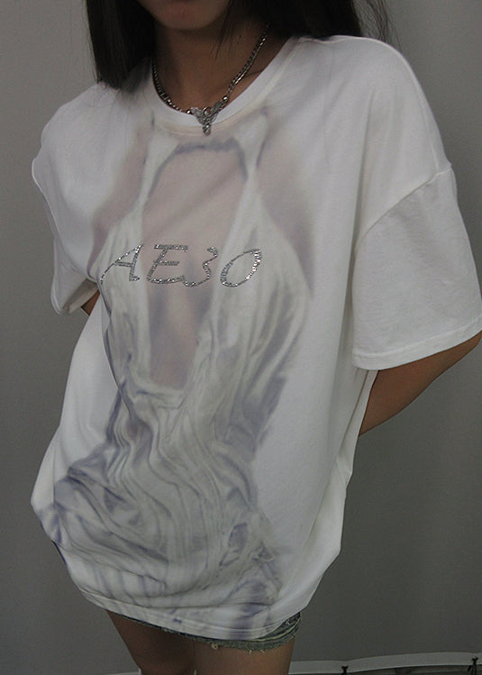 French White O Neck Print Tulle Patchwork Cotton T Shirt Summer